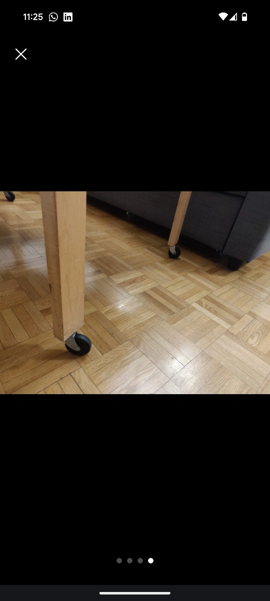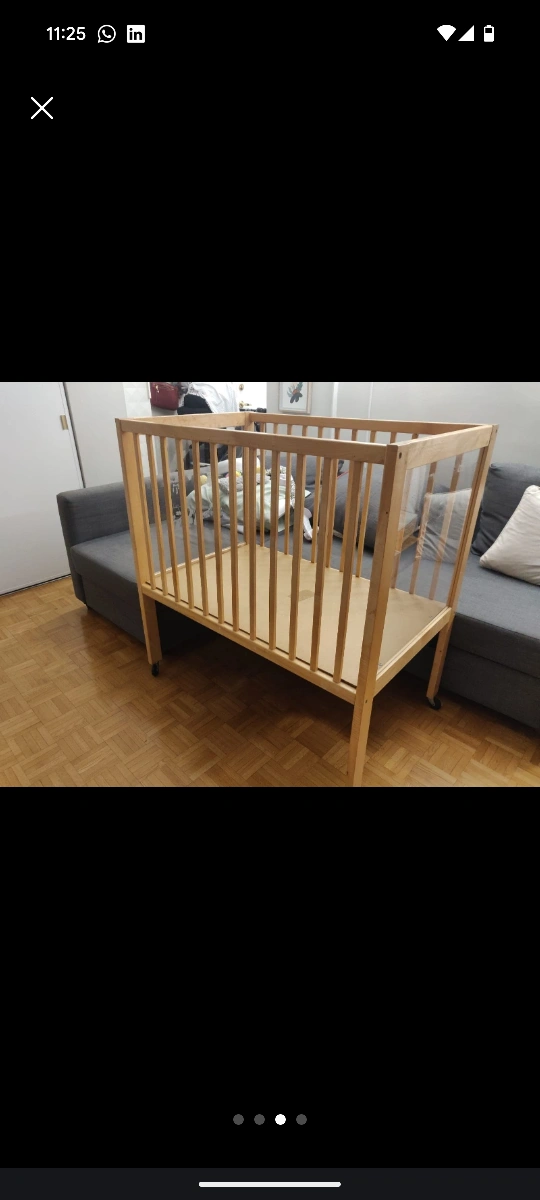 A wooden crib. Featuring wheels for easy moving. It could be perfect for your little one. It is super safe and build to last crib. We received it from a daycare last year and we are now donating for someone in need. - Item is 41.5 x 40 x 25.75 inches. It has wheels to move it around. - It needs a mini crib mattress. - The side windows have some glue spots. It never bothered us.