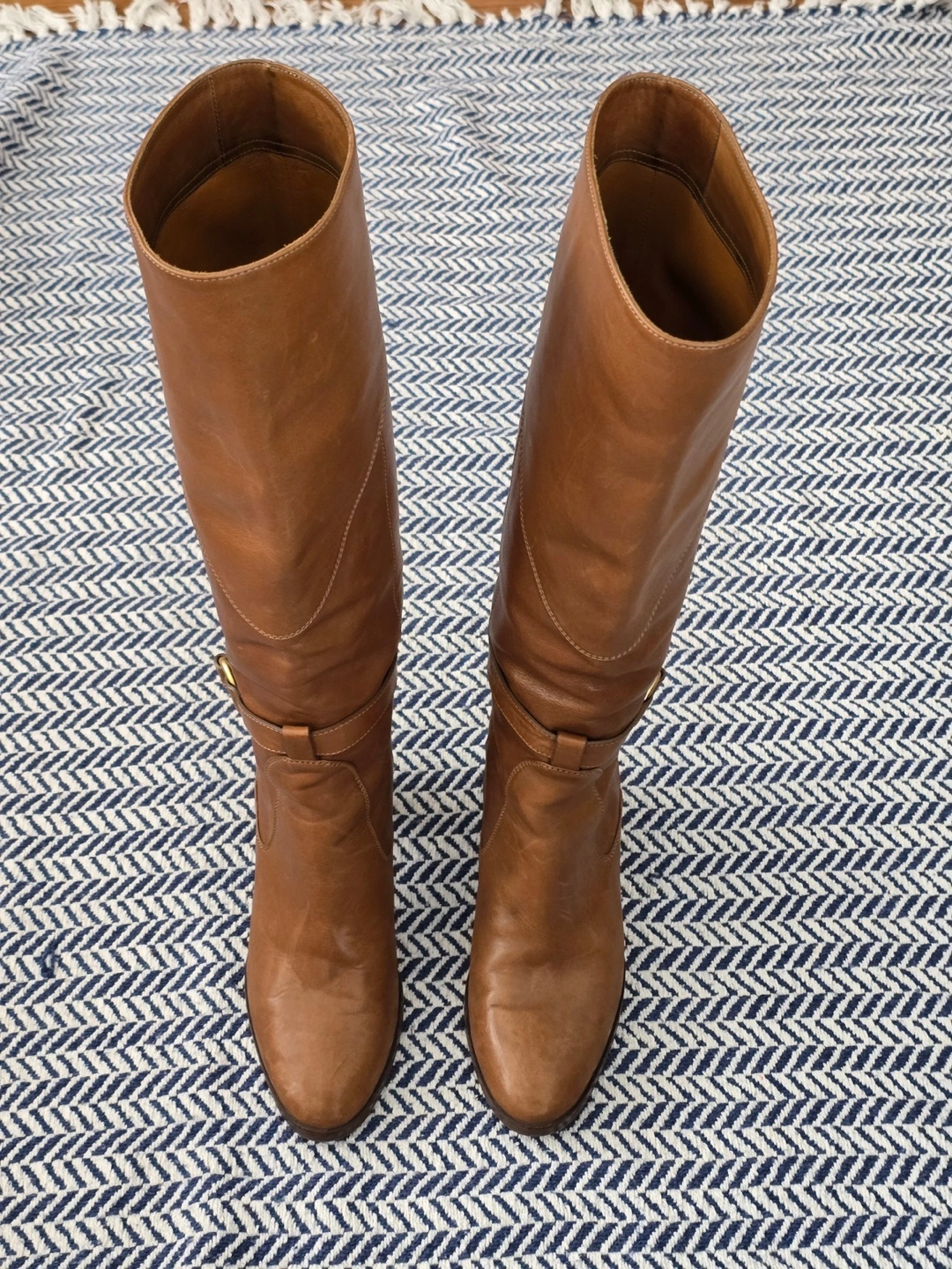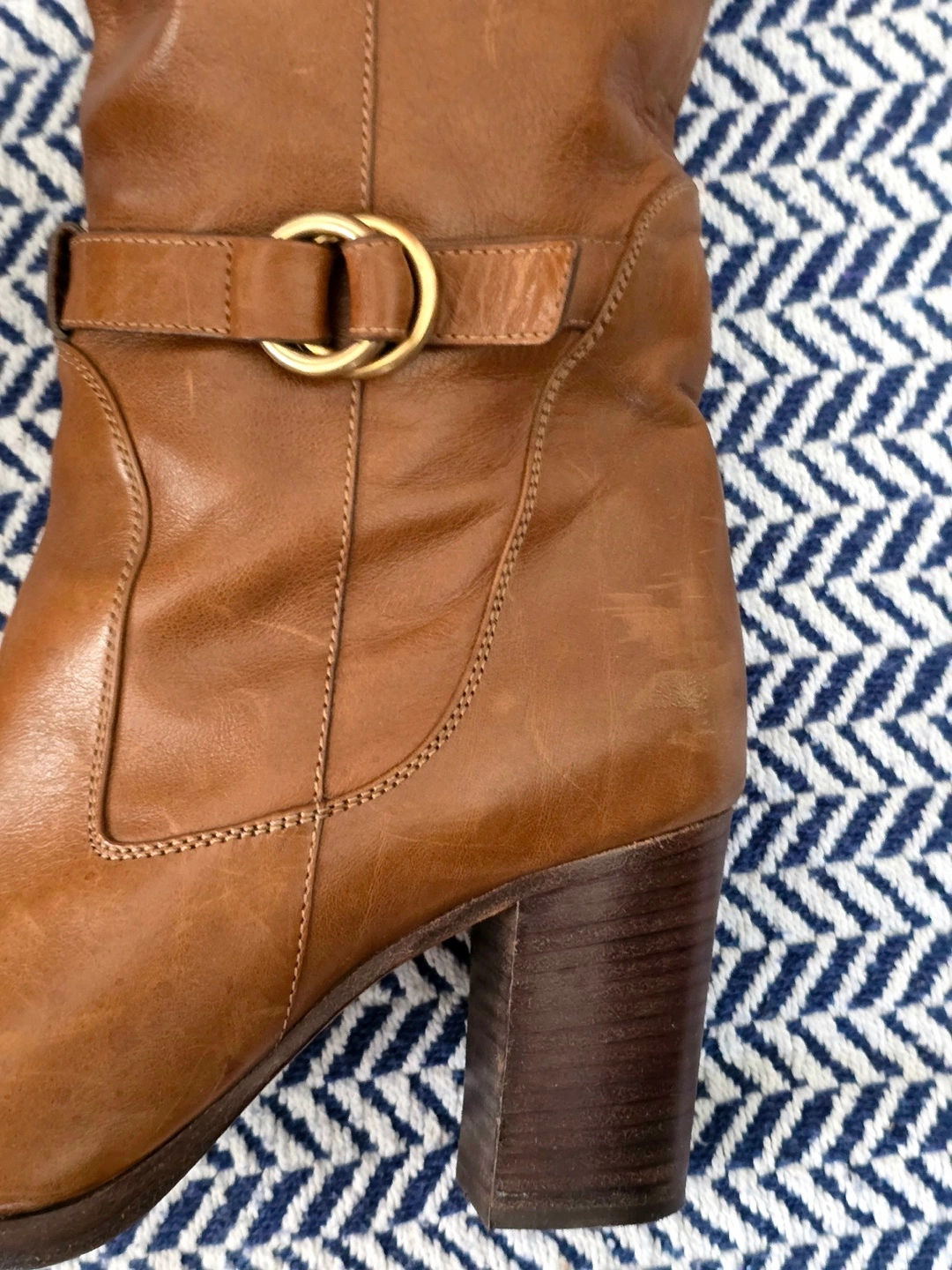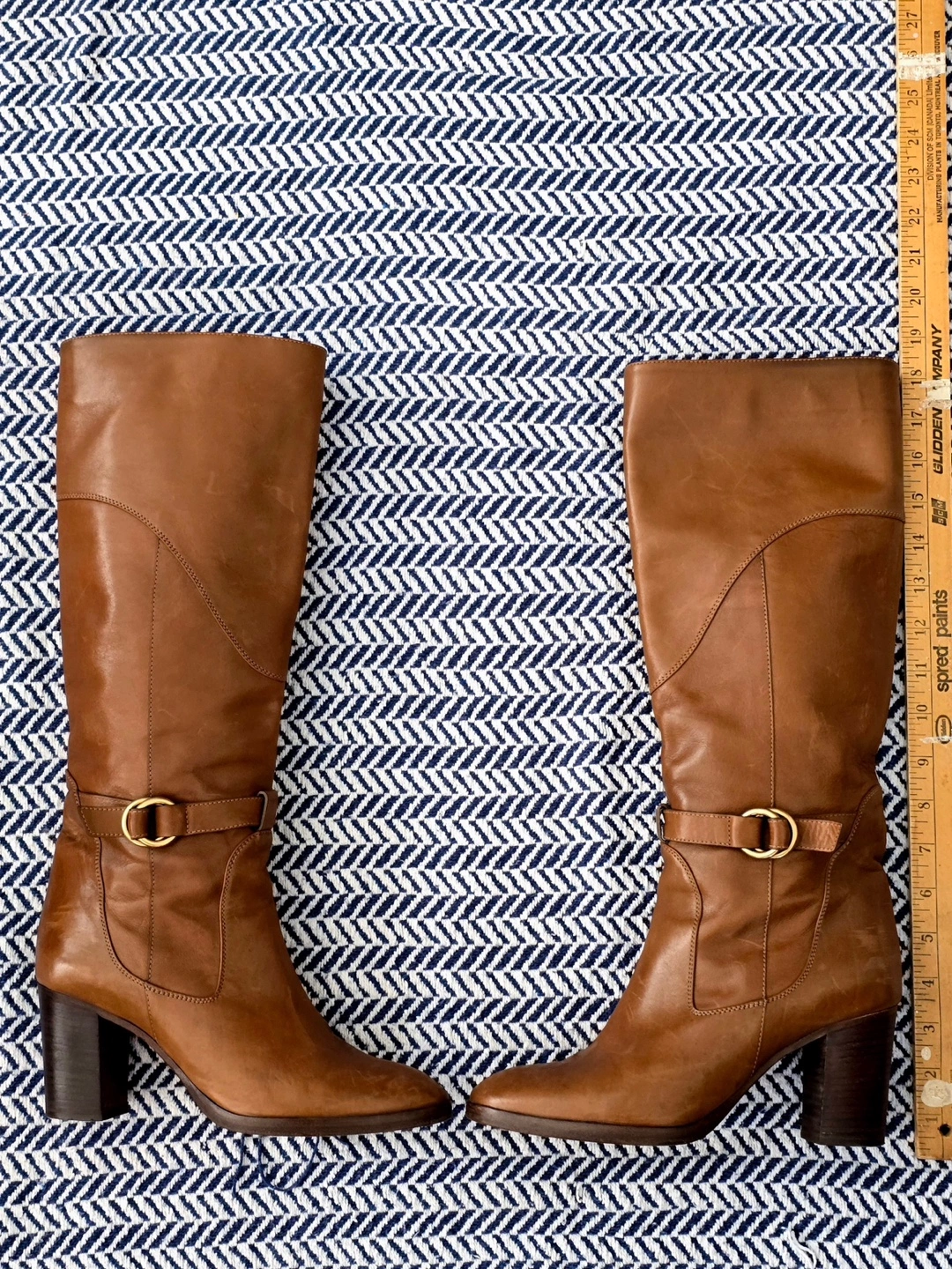 Chloé knee high boots with a heel and a buckle detail. Crafted in tan leather. These boots would be the perfect staple in your wardrobe.