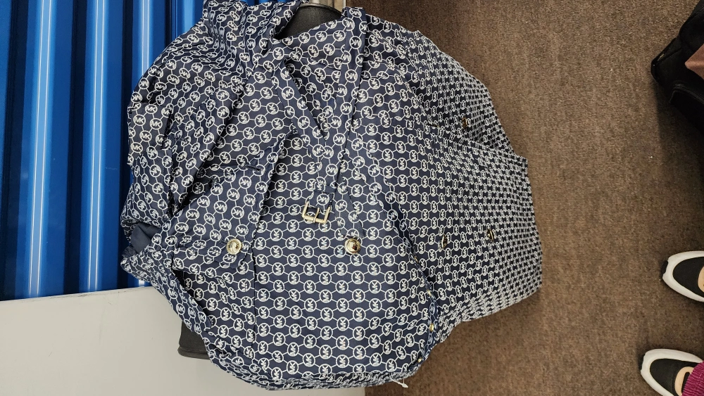 A navy monogram trench coat. Gold-toned buttons. Belt loops. Enjoy a stroll on a rainy day in this stylish coat, feeling at ease.