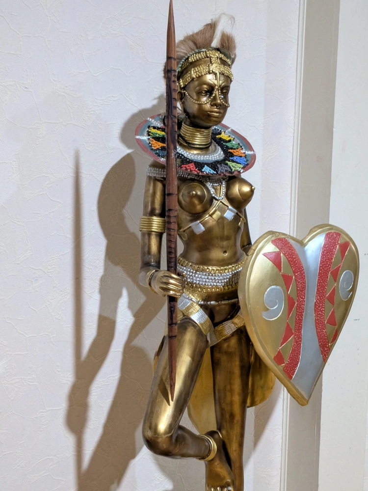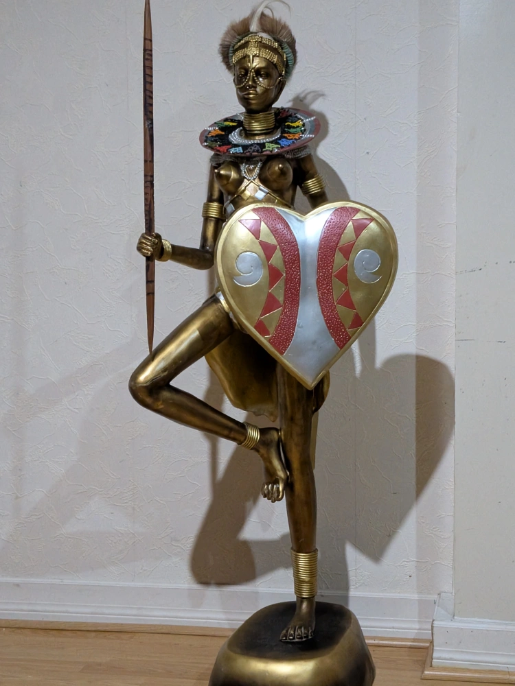 Rare and striking warrior statue standing approximately 52 inches tall and weighing 46 pounds. Crafted from an unknown material (not bronze).A powerful symbol of strength and heritage – perfect as a statement piece for homes, galleries, or cultural spaces.