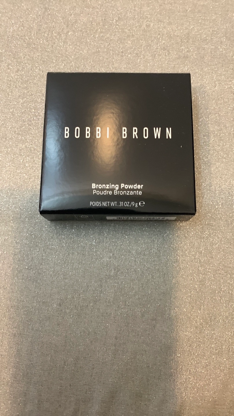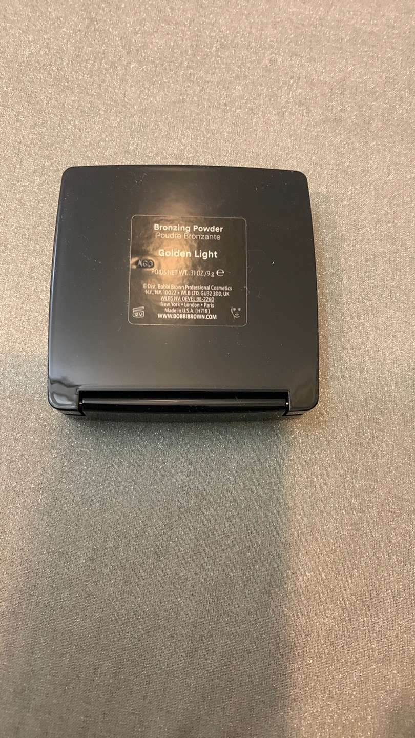 A sleek, black compact. Bronze powder visible inside. The lid opens to reveal a mirror. It is an ideal item to carry with you for a quick touch-up.