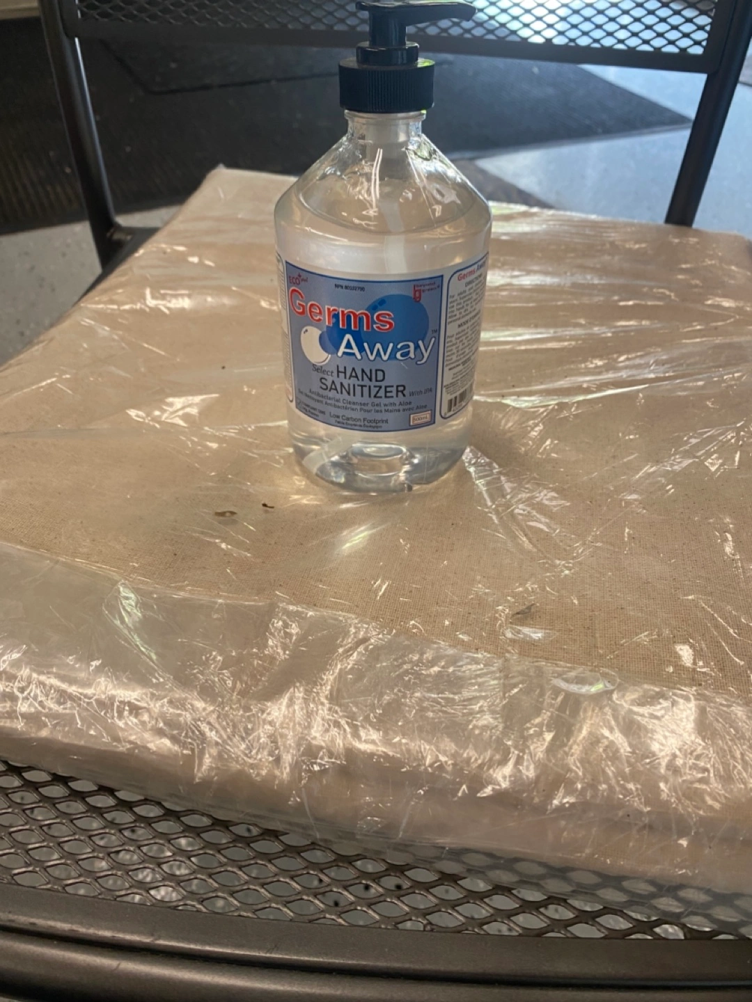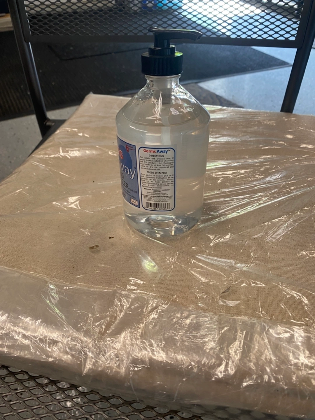 Clear liquid. Bottle with a pump. The label has blue and red accents. The item can be used to keep your hands clean and safe. Box of 6