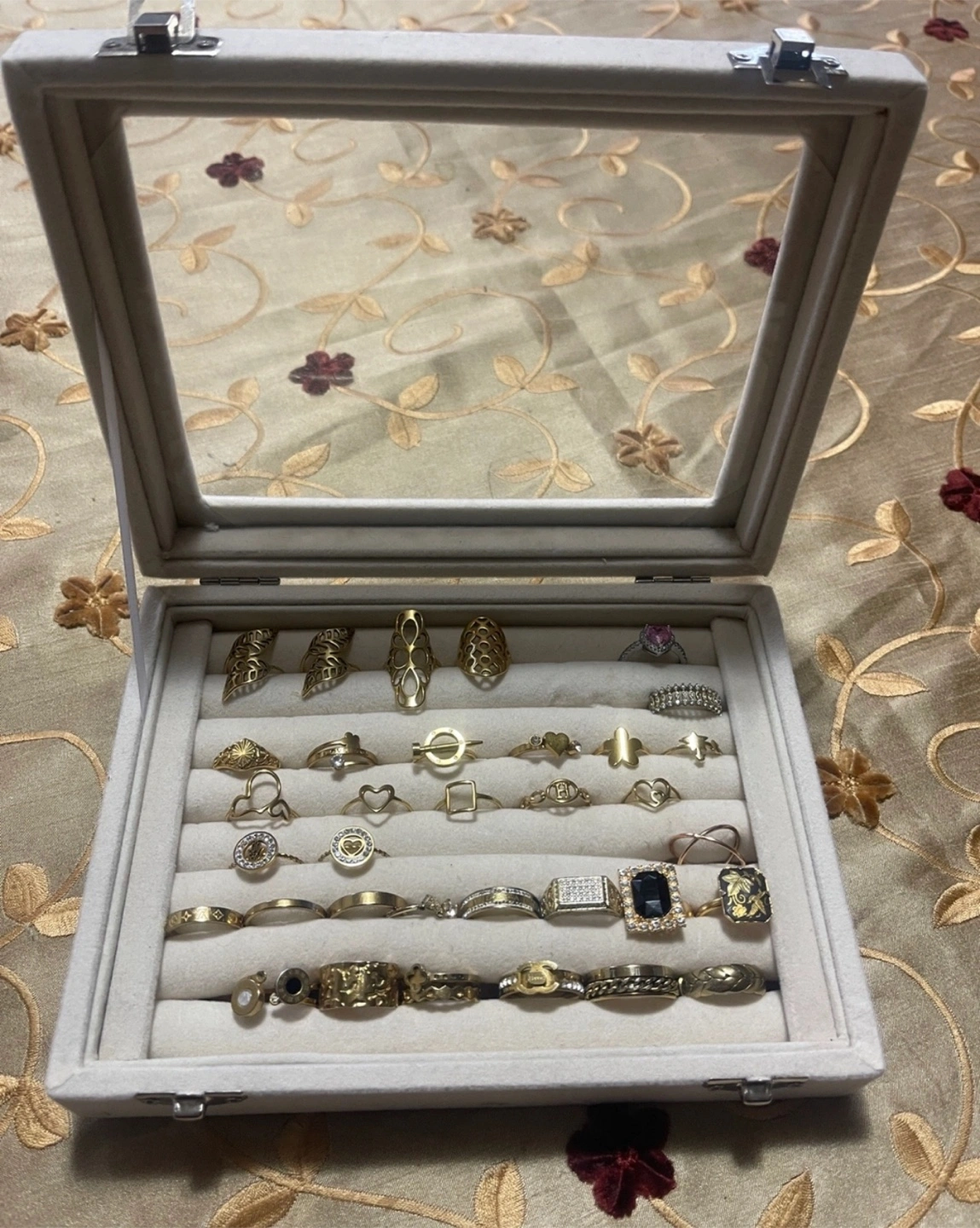 A beautiful box that would be a lovely addition to your bedroom, ready to organise all your favourite rings. The box is a neutral colour with a clear lid, and holds many rings of varying styles and colours.