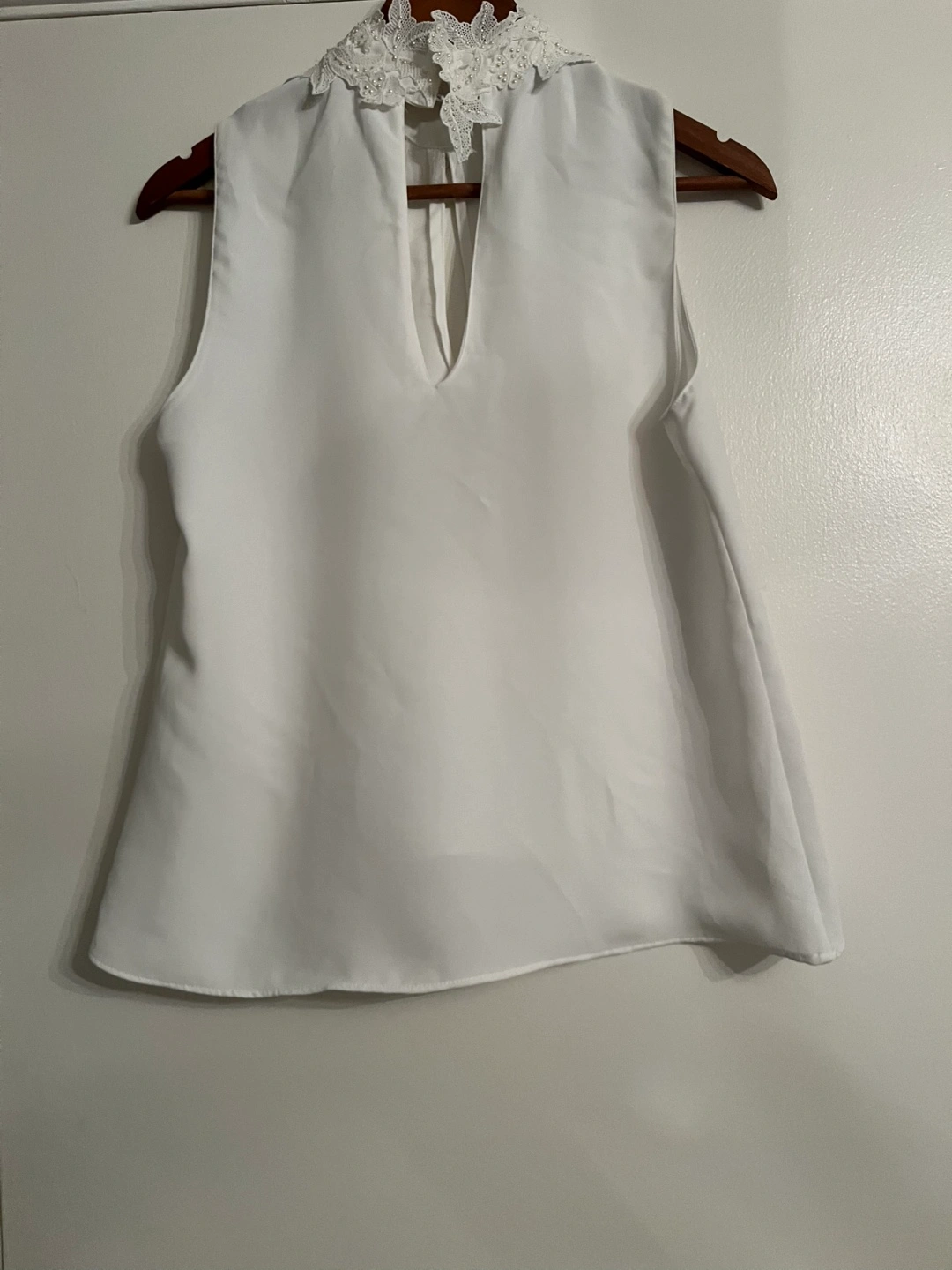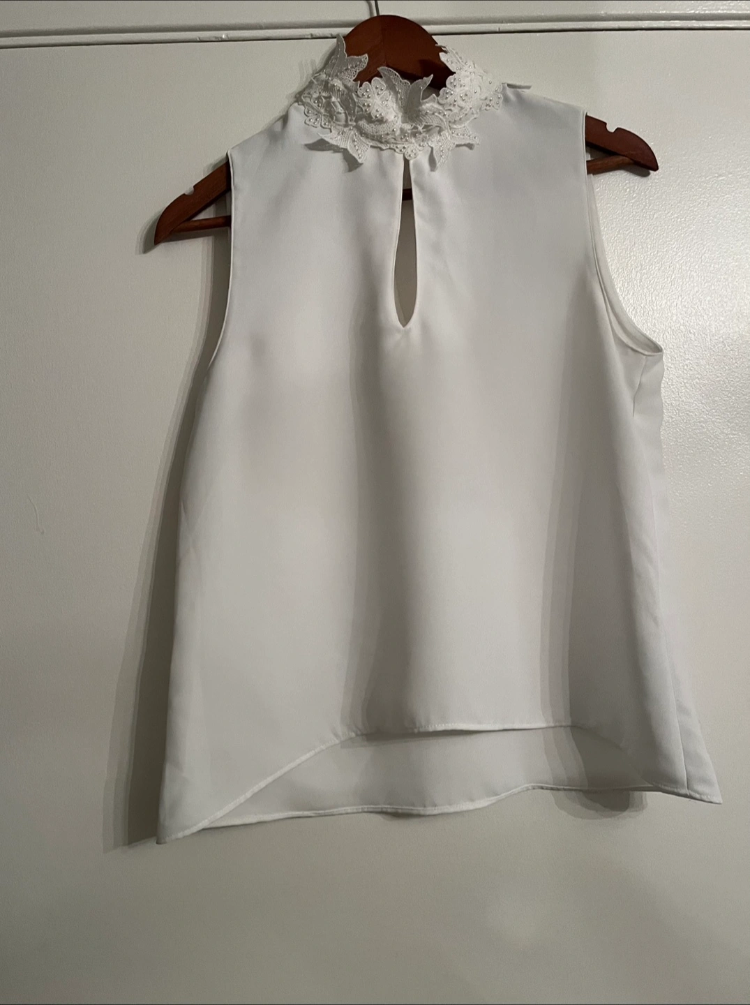 A elevated sleeveless blouse. Features a decorative lace collar with pearl accents. A keyhole detail in the front.