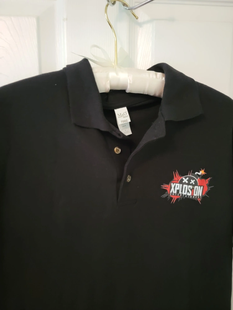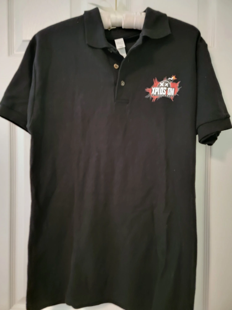 A black polo shirt, featuring a logo on the front. The shirt is a short-sleeved style. Perfect for any casual occasion. You can feel comfortable wearing this shirt while doing some shopping.