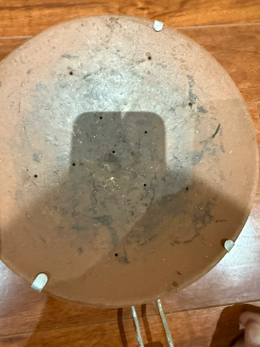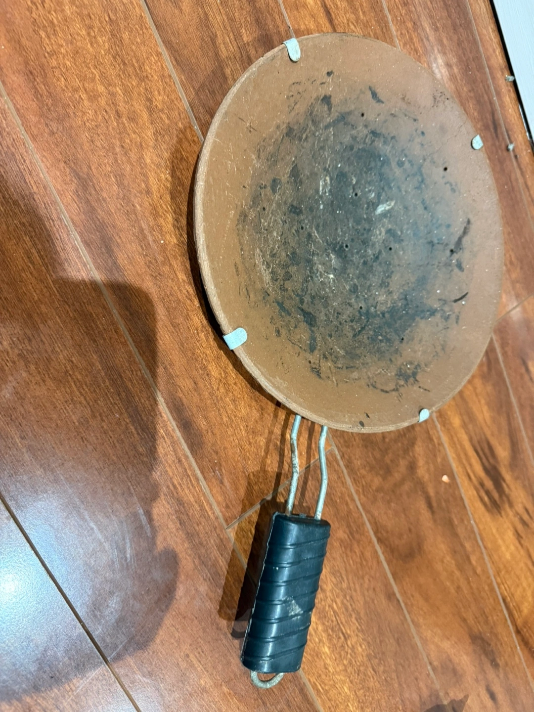 A round ceramic plate. It has a metal frame and a black handle. This plate can be used to gently warm up your favourite flatbreads, or even make them from scratch.