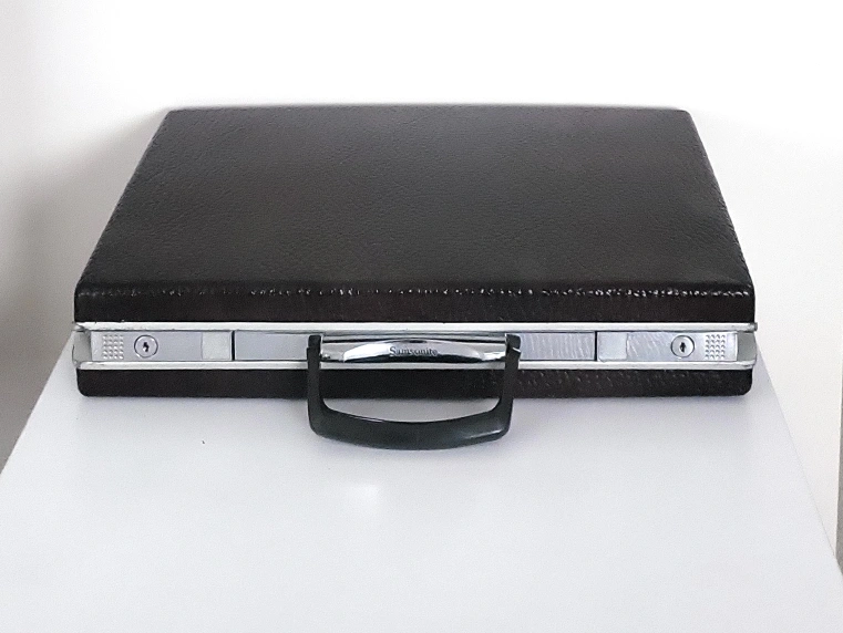 A dark brown, textured briefcase. Features a silver trim and locking mechanisms. The interior has several compartments and pockets. A beautiful briefcase to keep important documents safe and organized.
