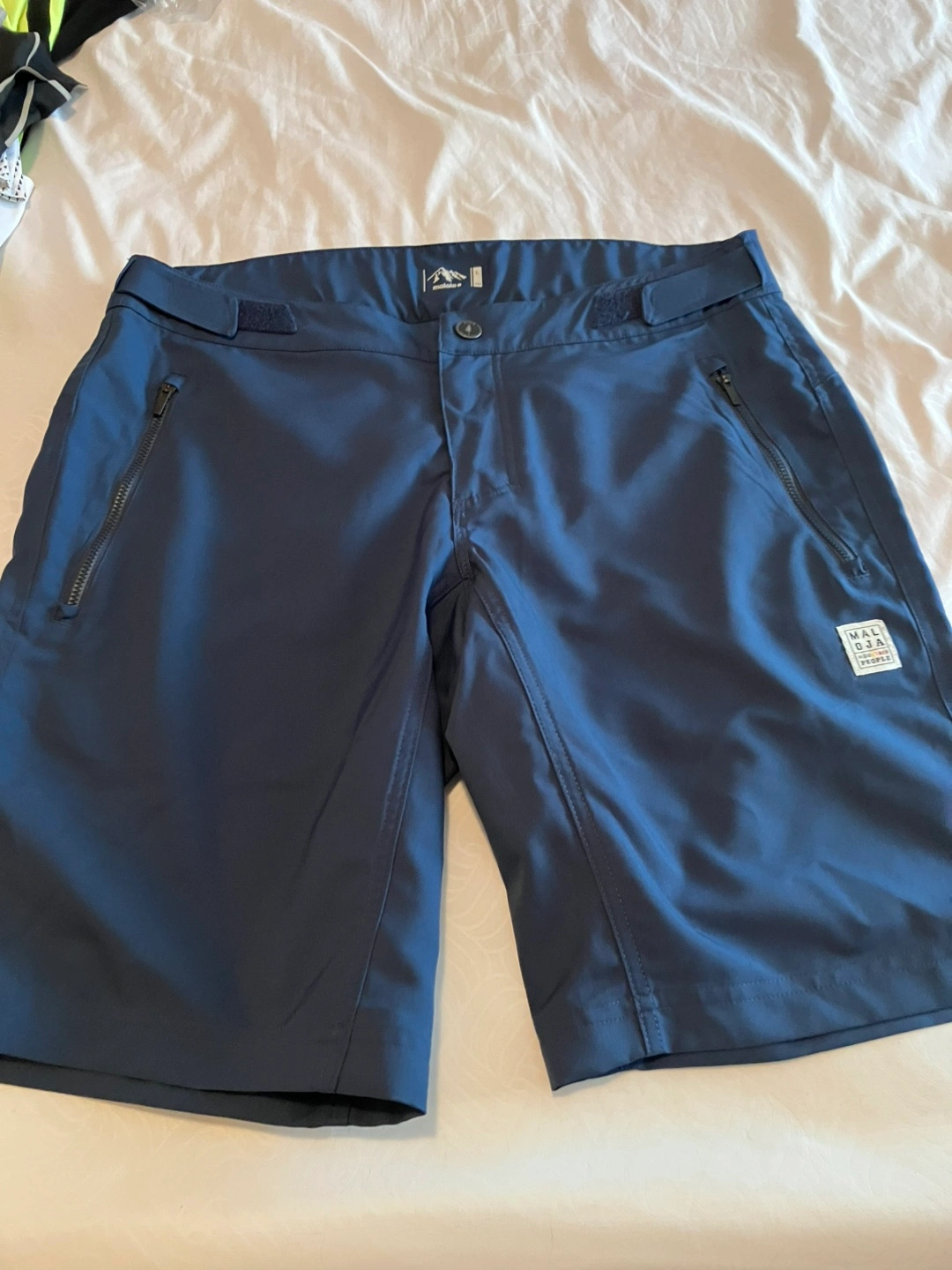 Stylish shorts in a deep blue. Features a button closure, zipper pockets, and an adjustable waistband. Could be perfect for a leisurely hike.