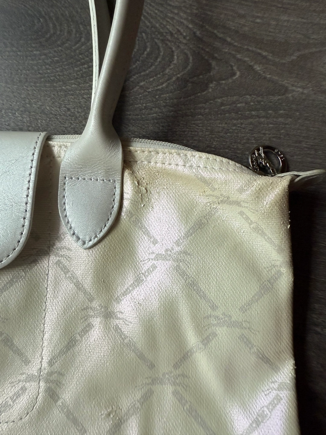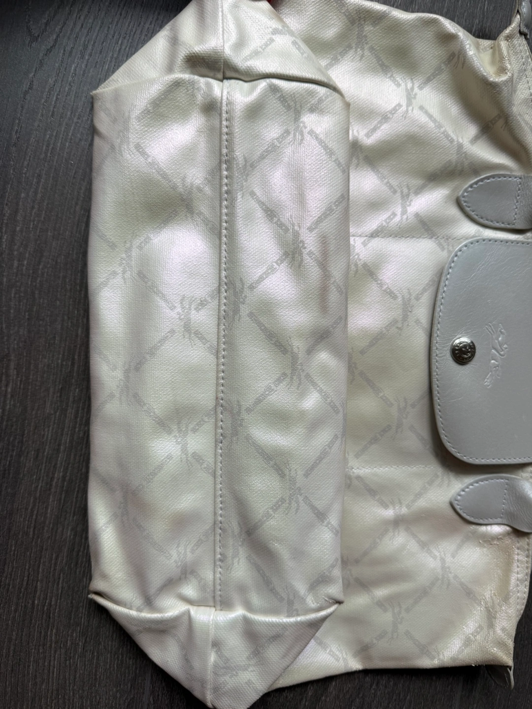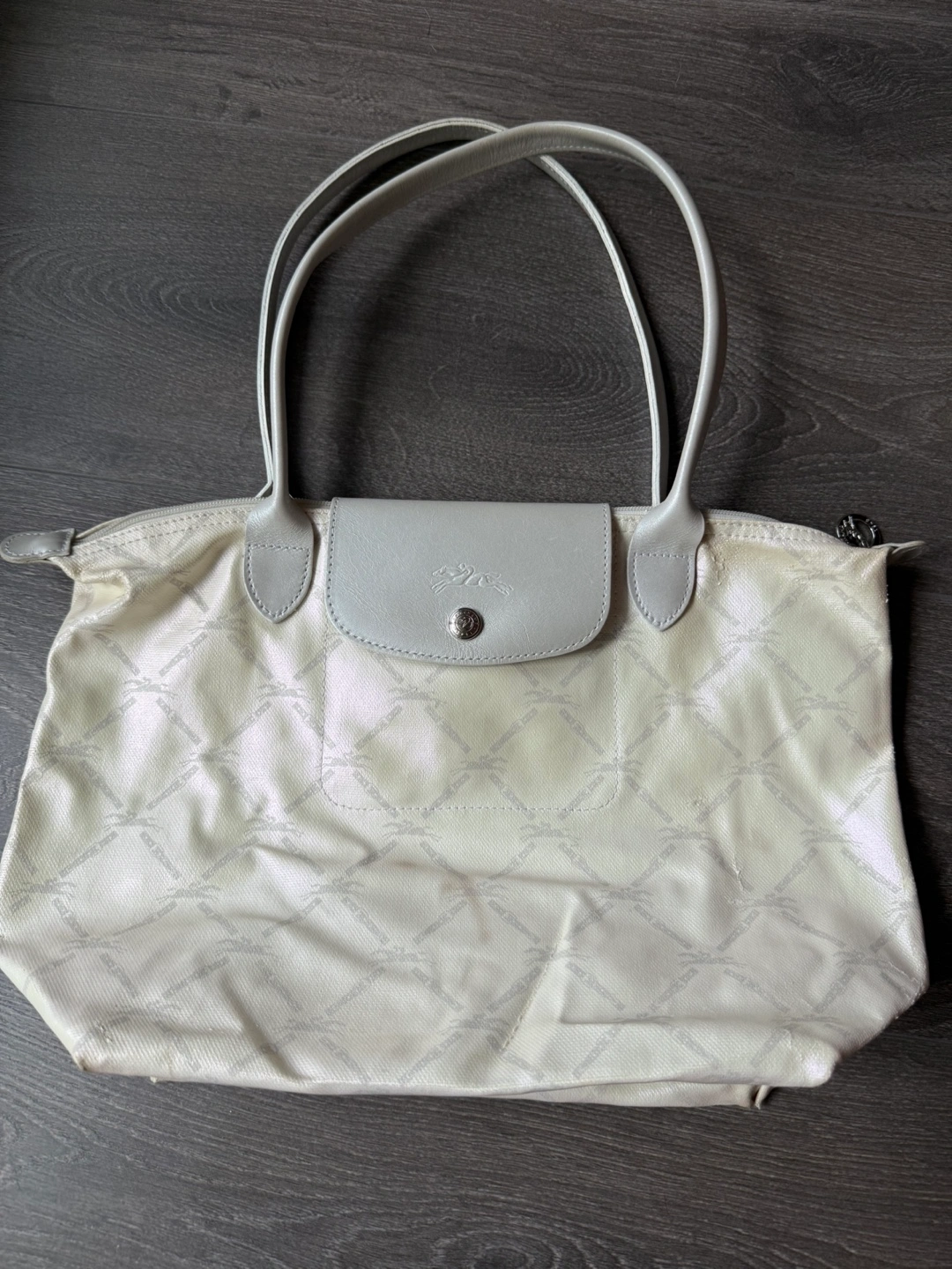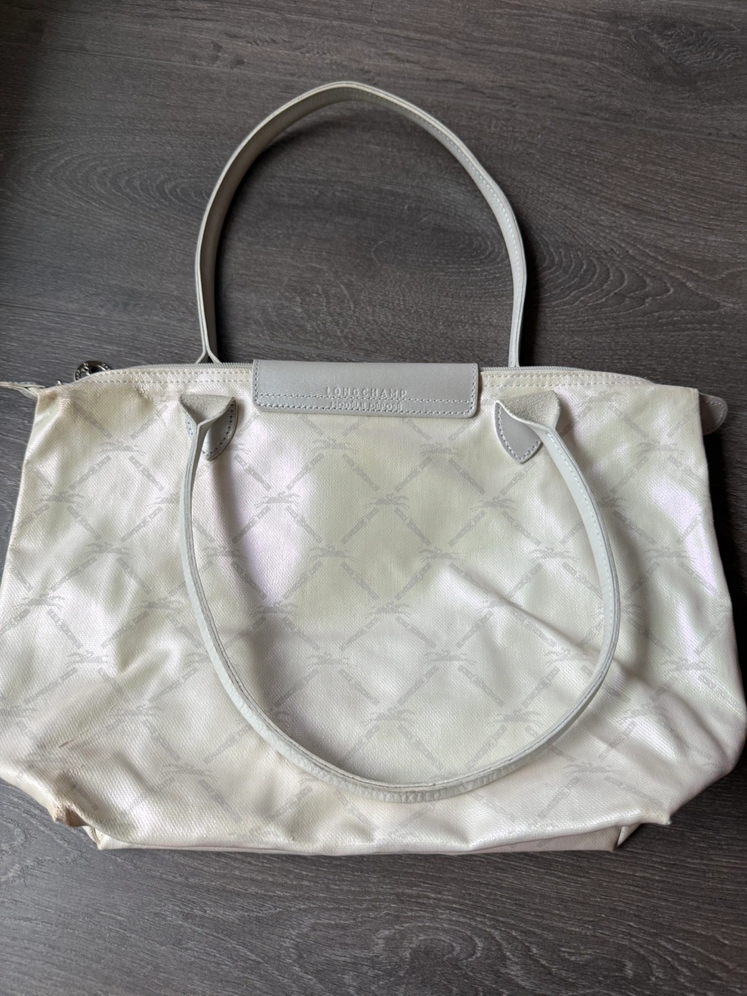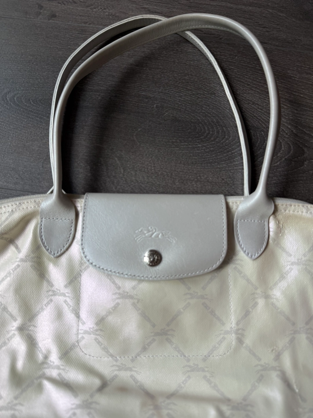 Longchamp le pliage tote bag small shoulder strap Good pre owned condition. Please see photos for wear and imperfections. Dimensions : 37 cm (L - measured at the base of the bag) x 26,5 cm (H) x 15,5 cm (W) Light coloured handbag. Includes handles. Features a flap with button closure. Printed pattern all over the exterior. A great everyday bag for all your essentials.