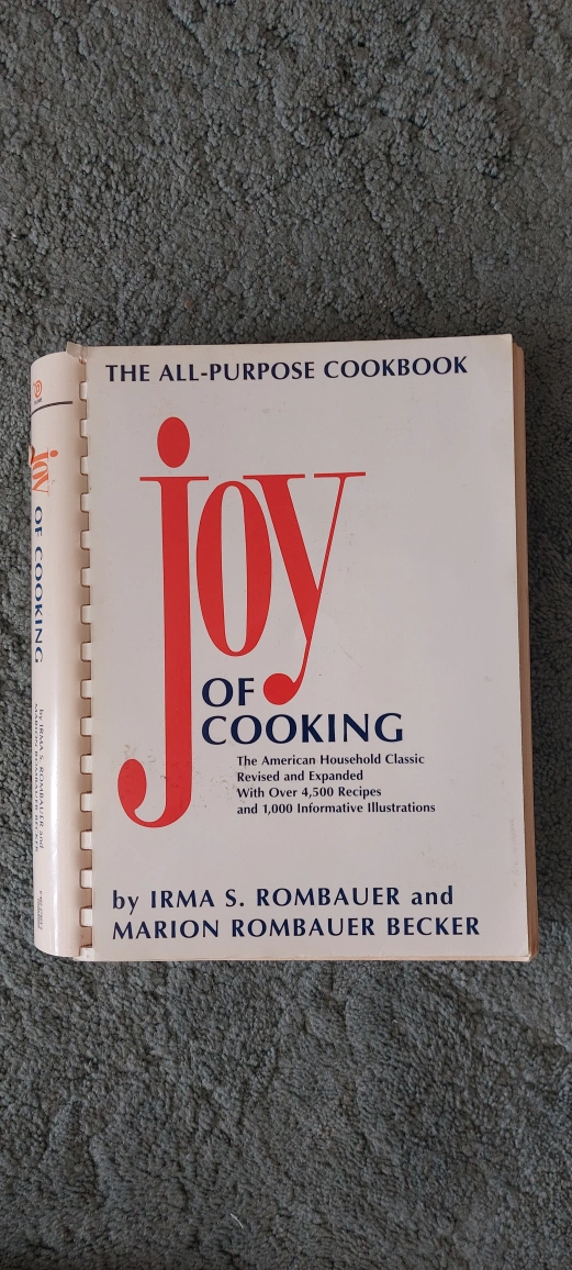A cookbook, used. The title is in large, red letters. It is titled "Joy of Cooking" and mentions over 4,500 recipes. Consider making a nice meal for yourself.
