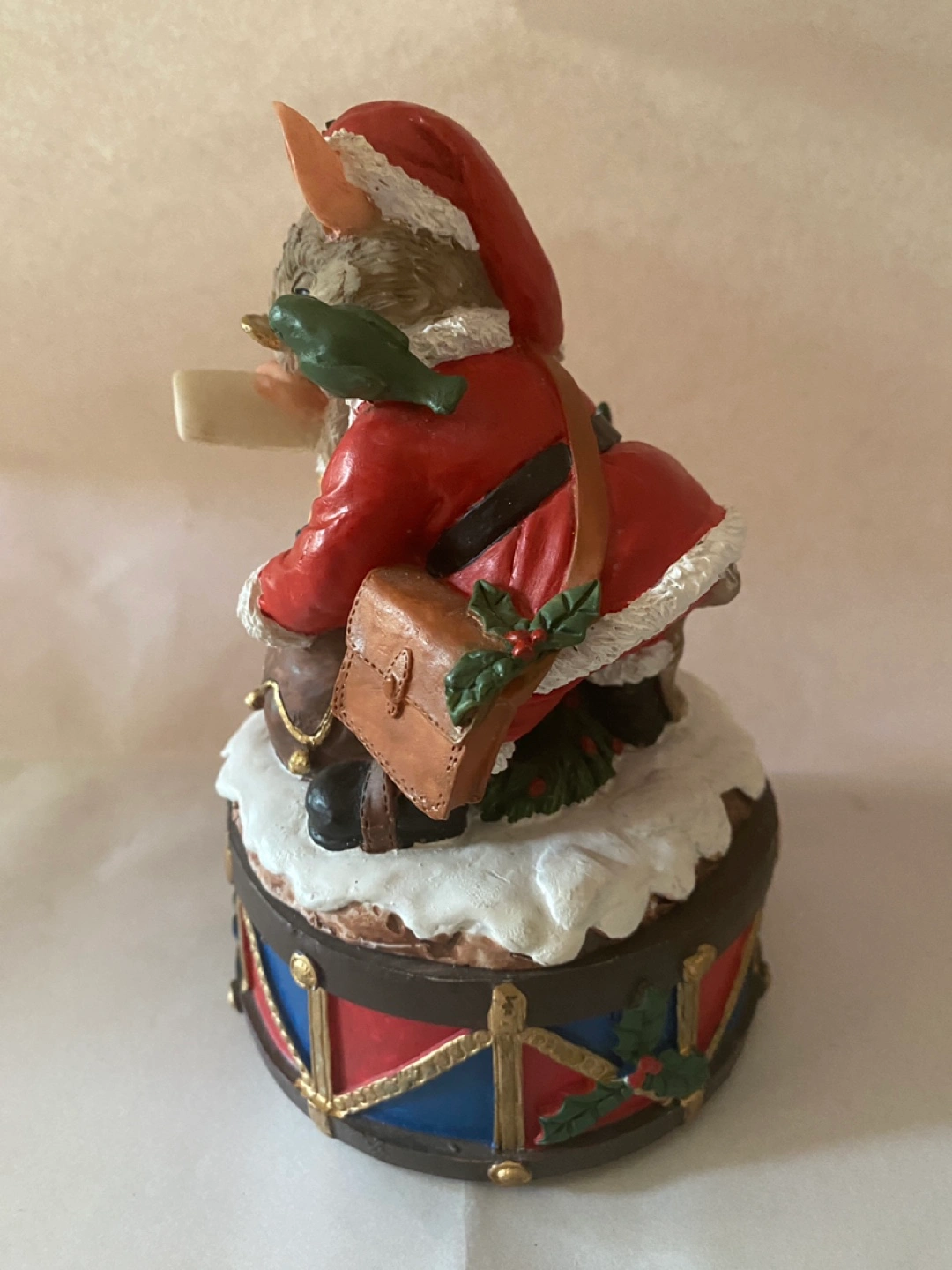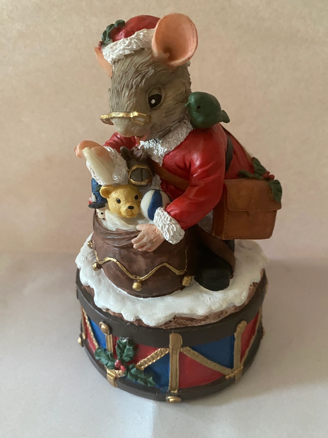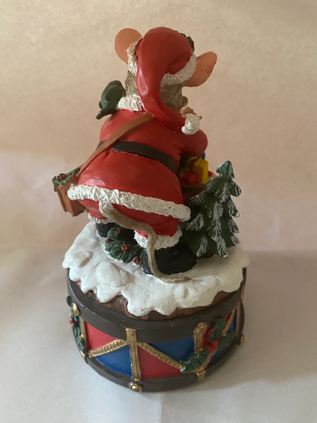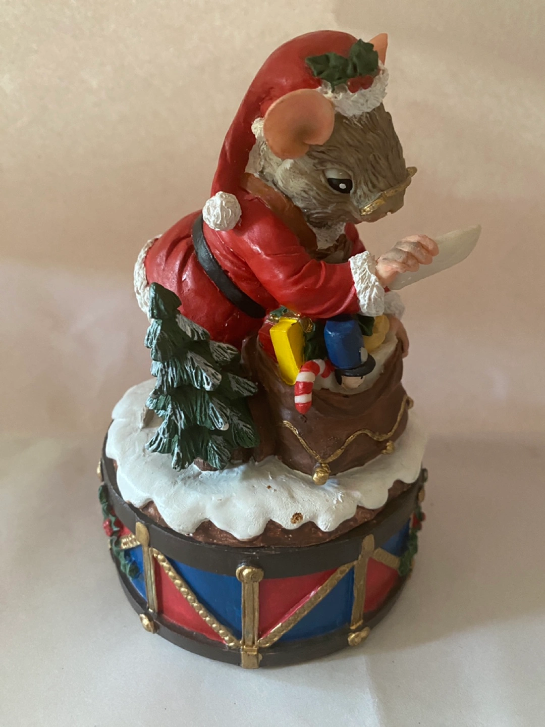 Adorable figurine of a mouse dressed as Santa. Features a drum base. The base has details with red, blue, and gold accents. Mouse figure has a Santa outfit with a brown satchel. Would be a great addition to any cozy holiday display. Melody “Oh Christmas Tree” Measures 6” high