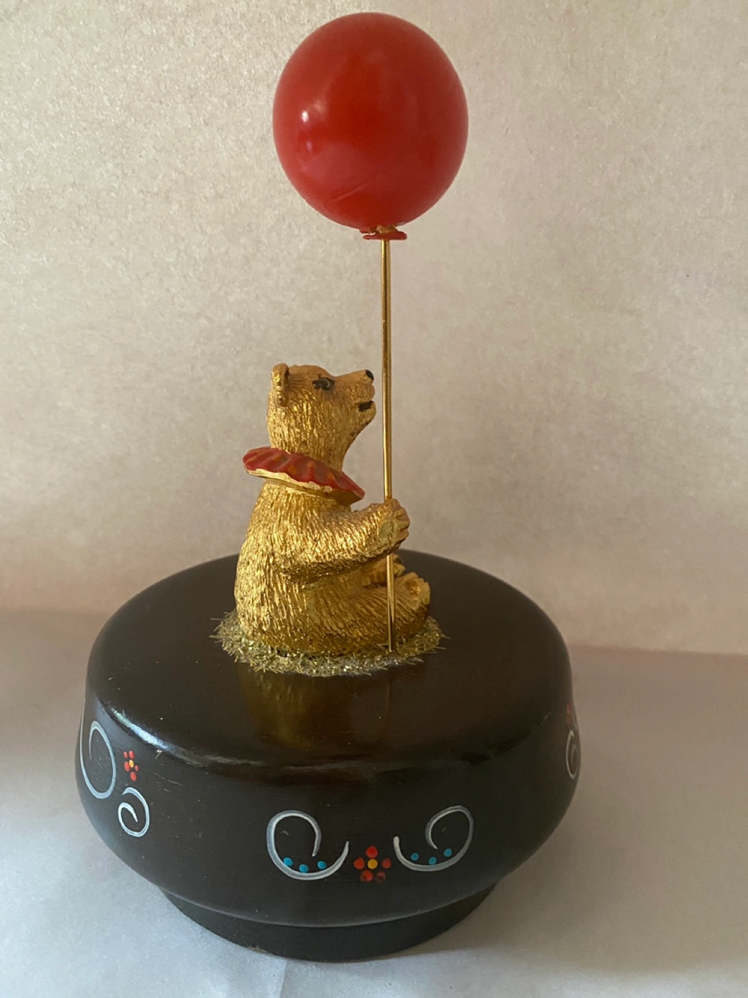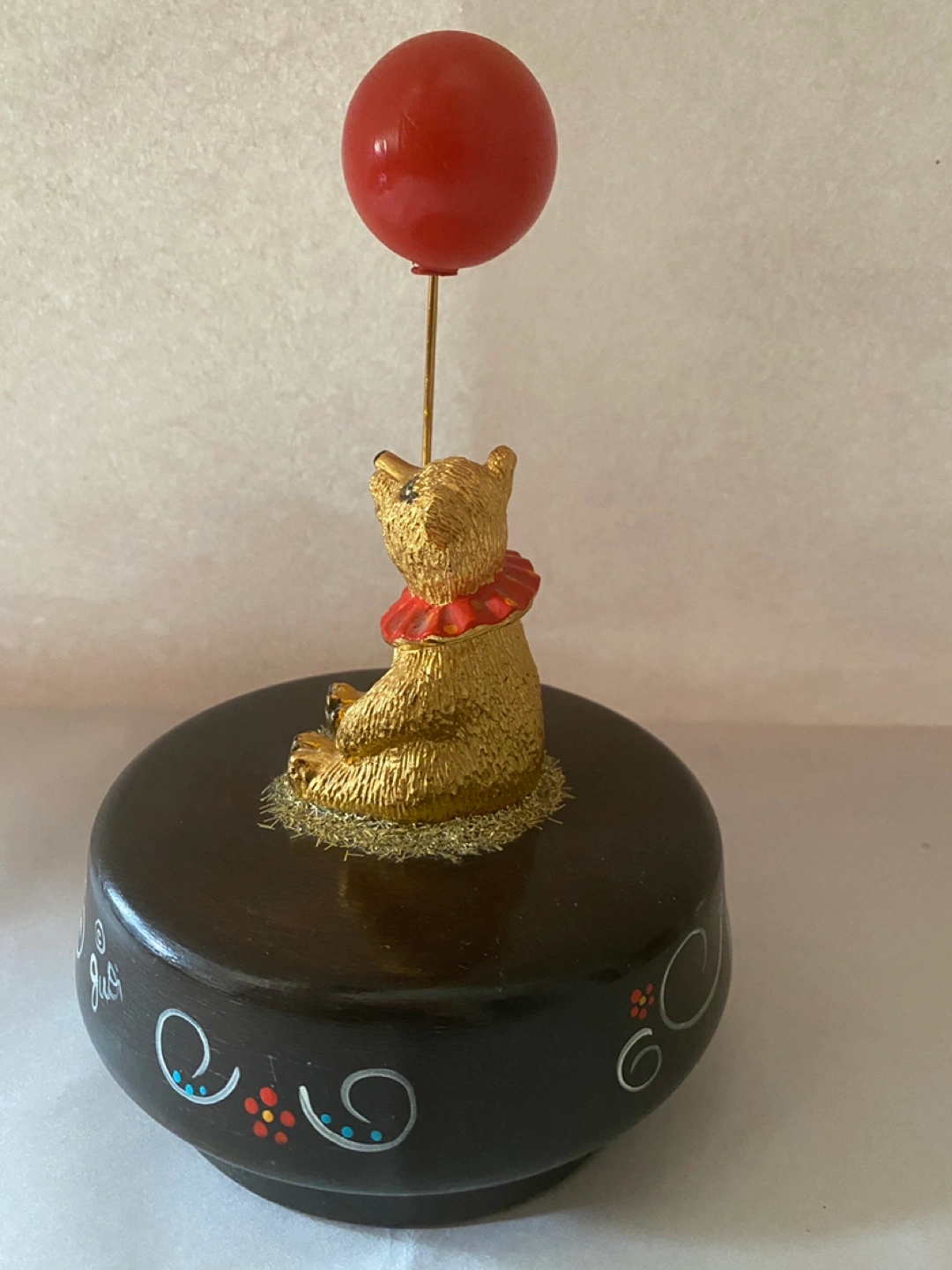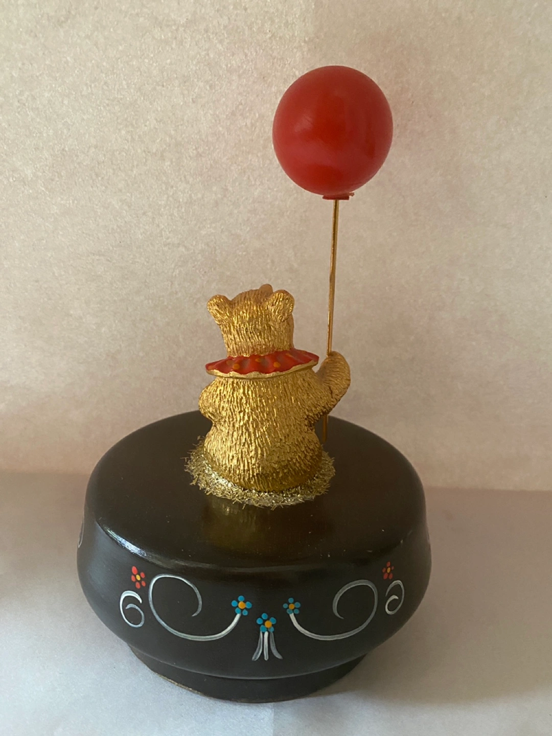 24K Gold Plated bear holding a red balloon. "It's a Small World" tune. "Guo Originals Of California" Hand Painted. 8 inches high.
