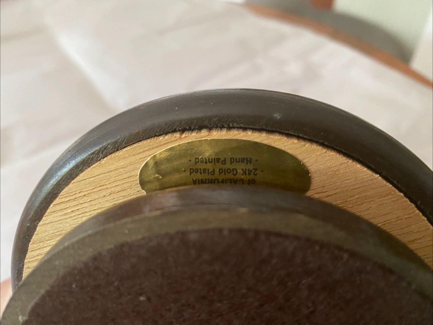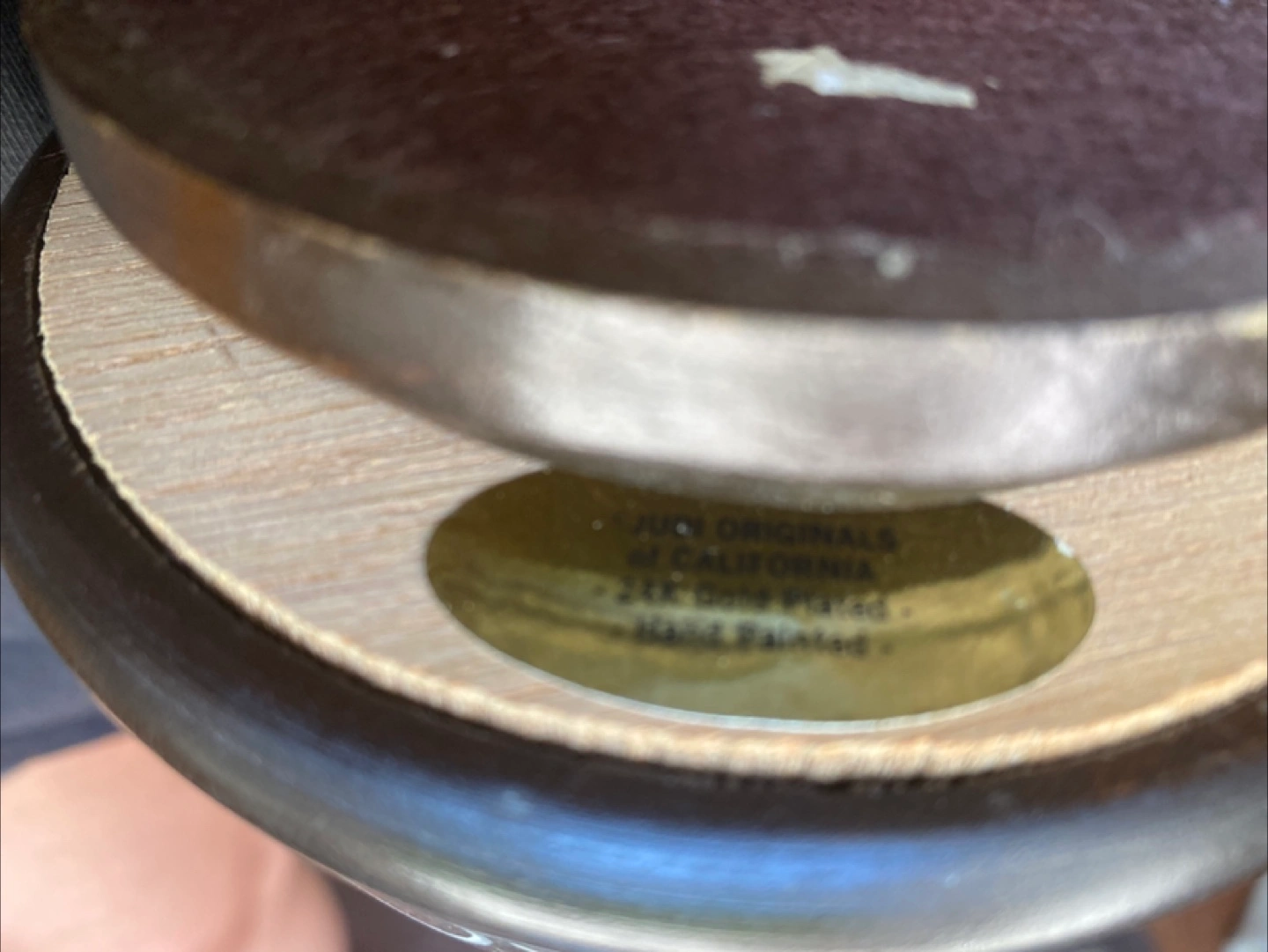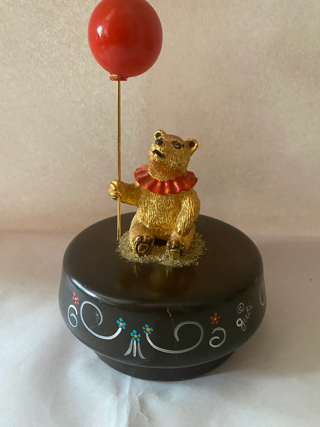 24K Gold Plated bear holding a red balloon. "It's a Small World" tune. "Guo Originals Of California" Hand Painted. 8 inches high.