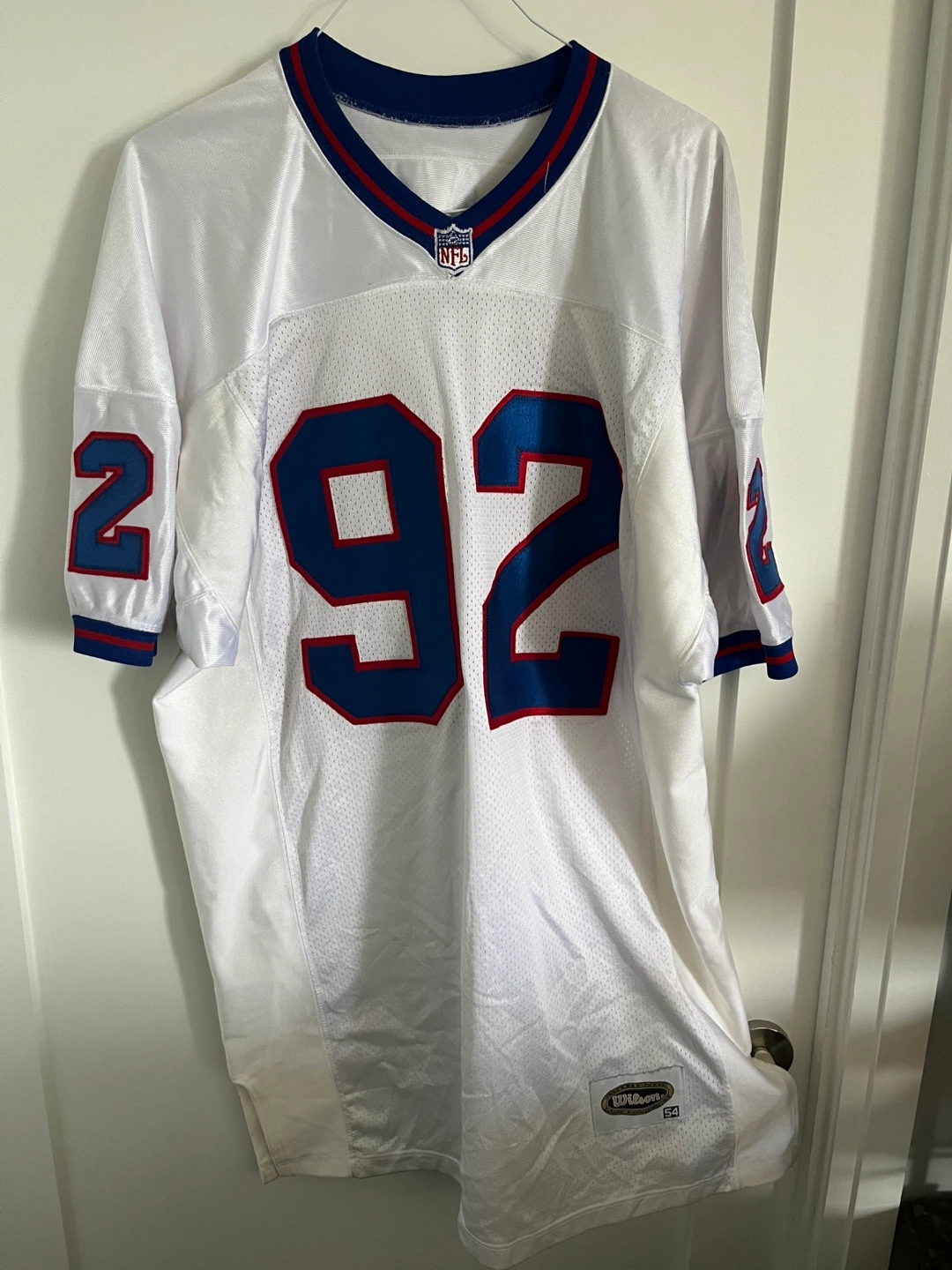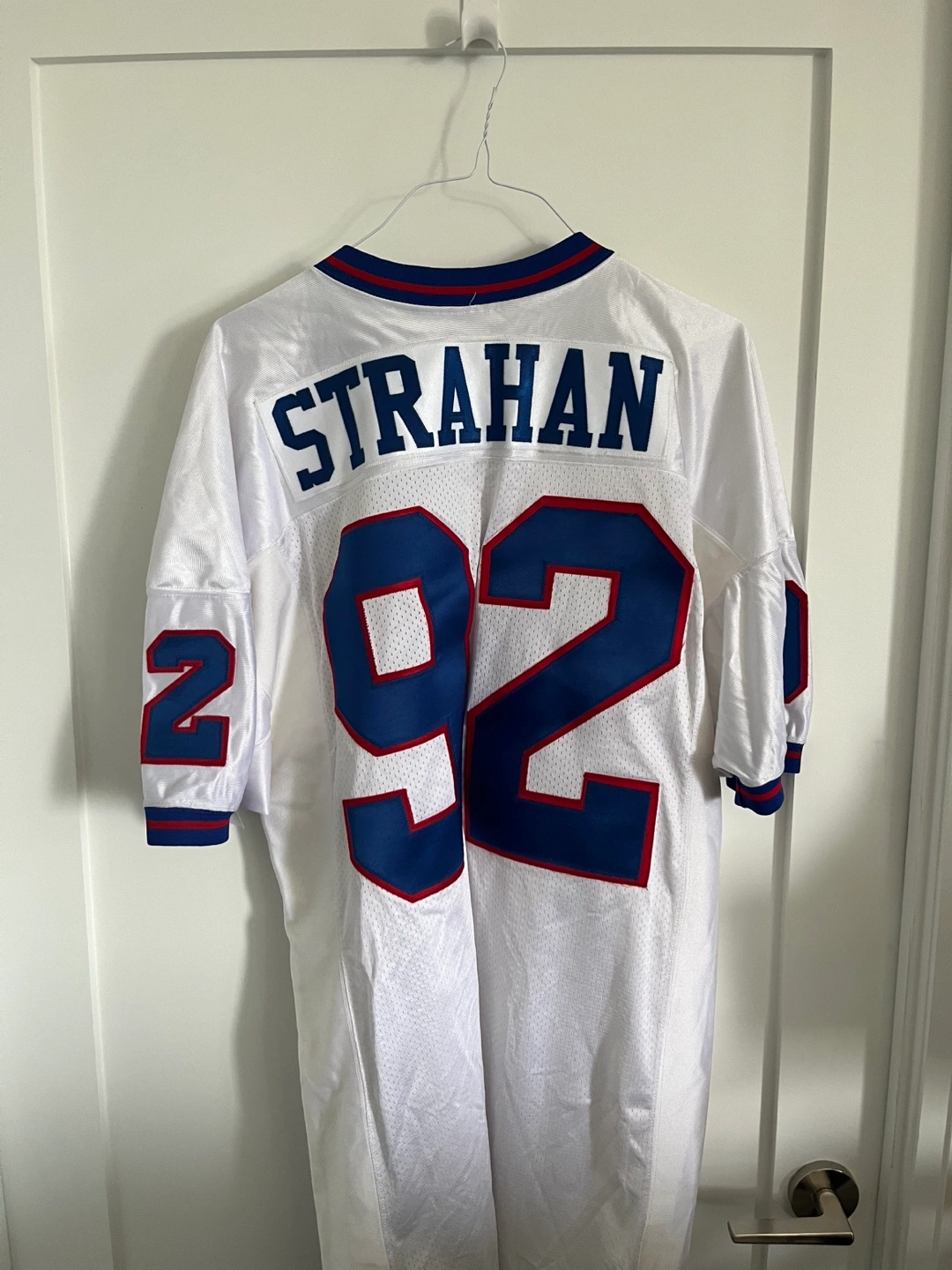 A white jersey with blue accents. Features the name STRAHAN and the number 92 on the back. Michael Strahan was inducted into the Pro Football Hall of Fame in 2014. It is authentic game equipment. It could be great to wear while watching your favourite team, the New York Giants play.