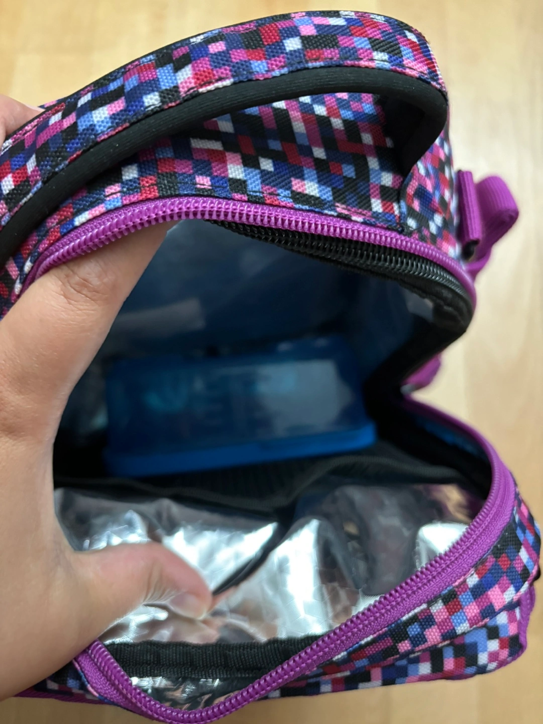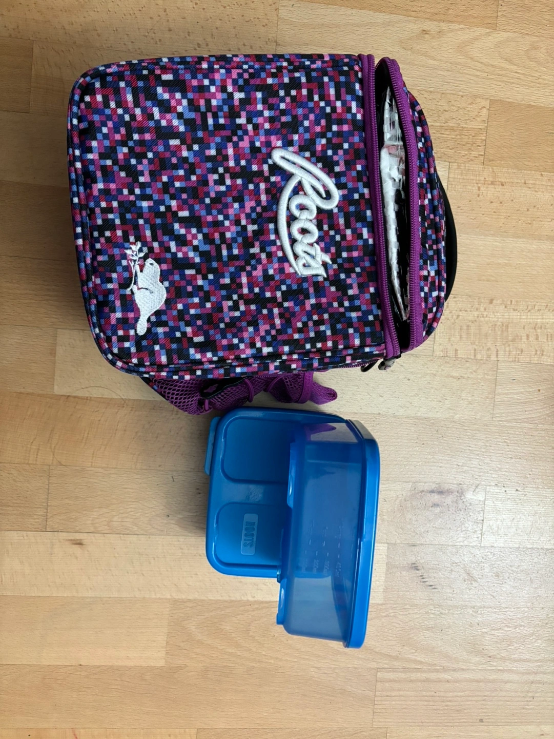 A colourful Roots insulated lunch bag with a matching container. The lunch bag has a zipper closure, and a carrying handle. A simple way to prepare food for yourself or your loved ones can feel so good.
