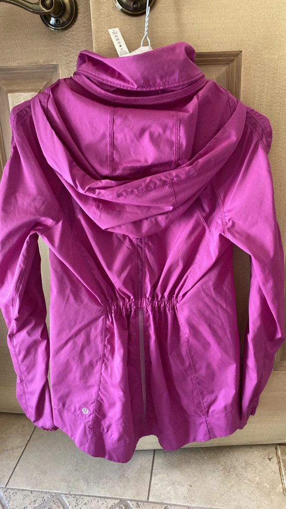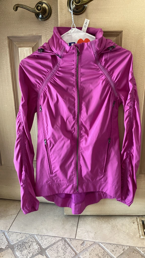 A great athletic jacket in a vibrant pink colour. It features a hood and a zipper closure. There are pockets on the front and the sleeves have a ruched design. You could wear it during an evening stroll for added warmth and comfort. paid 300