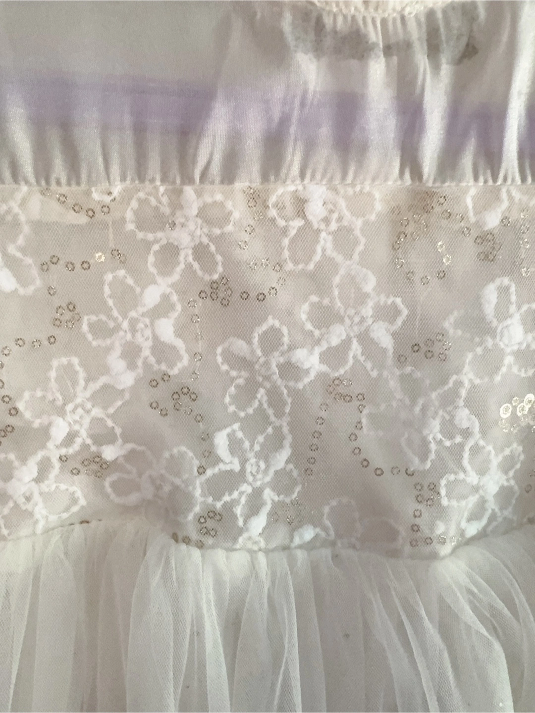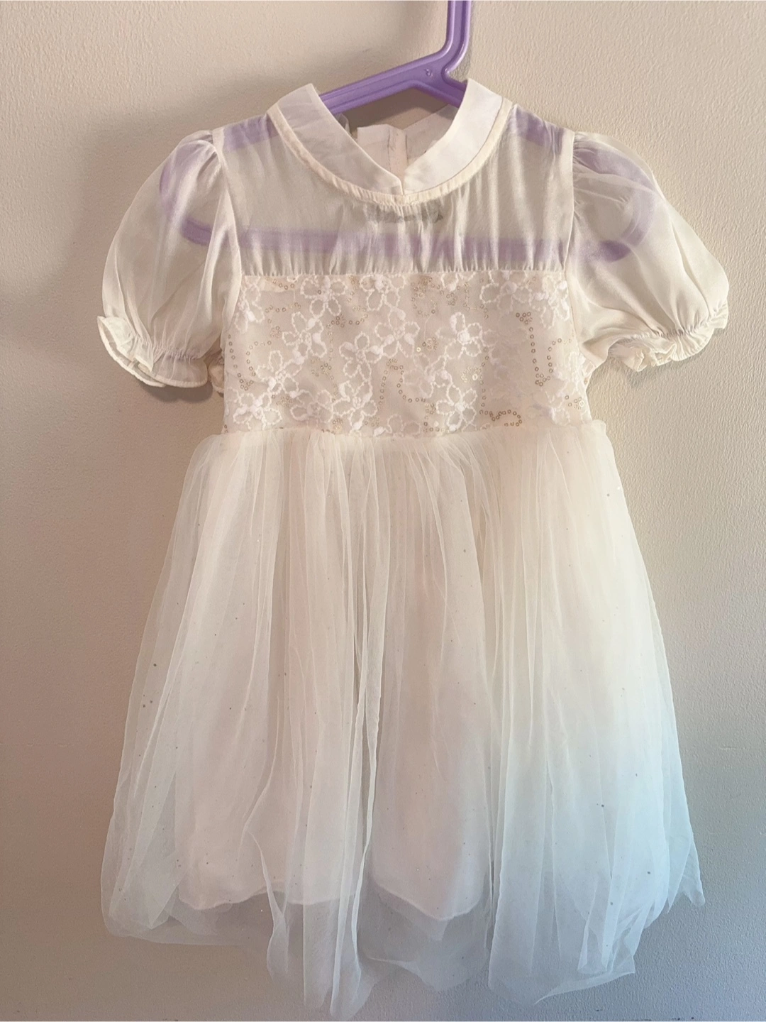 Beautiful white dress. Puff sleeves. Delicate flower detailing. Layers of tulle. Inner layer is cotton.