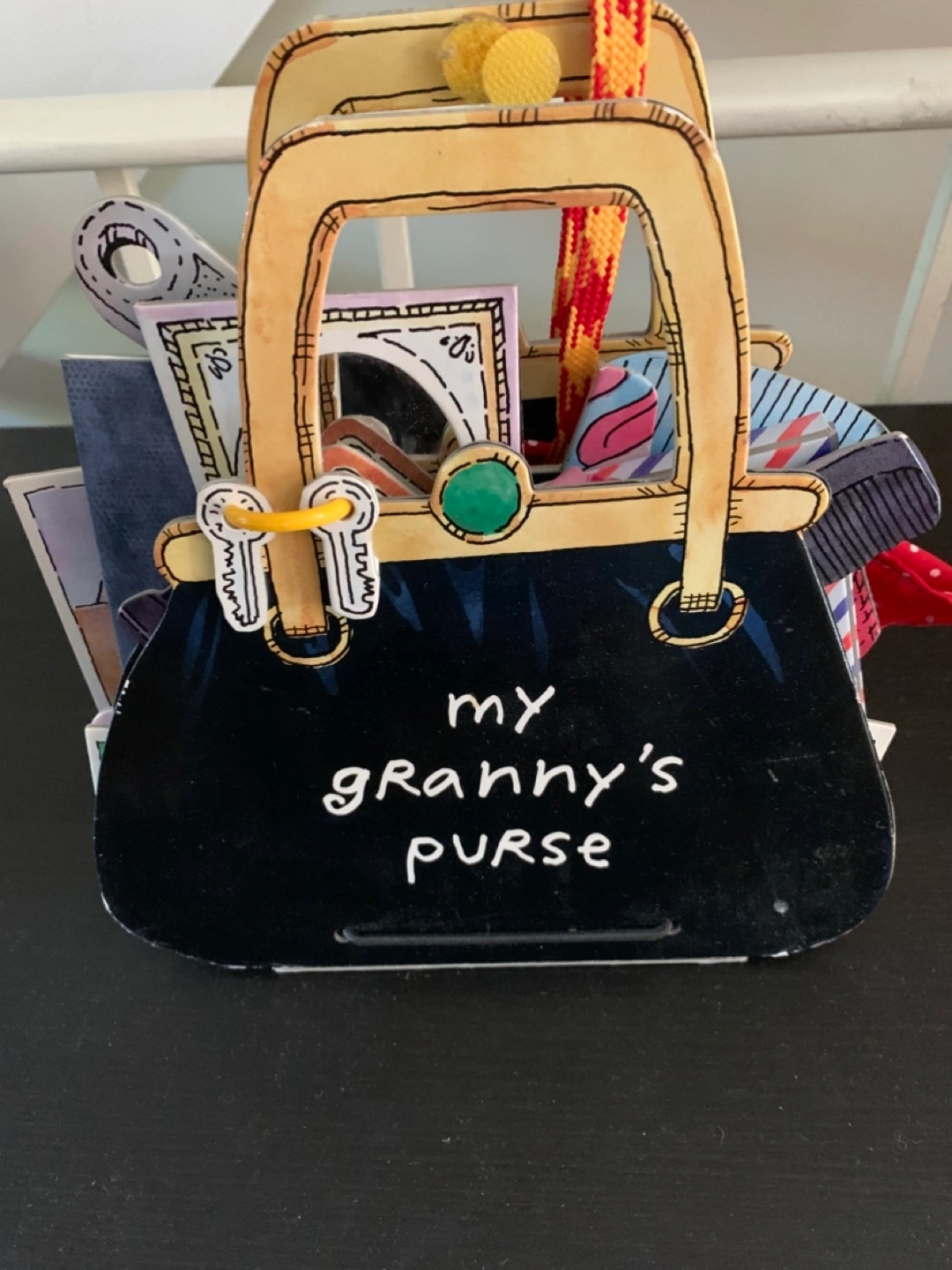 An interactive toy purse (made of cardboard) with colourful images of various objects that may be found inside a purse. Couple of flaws.