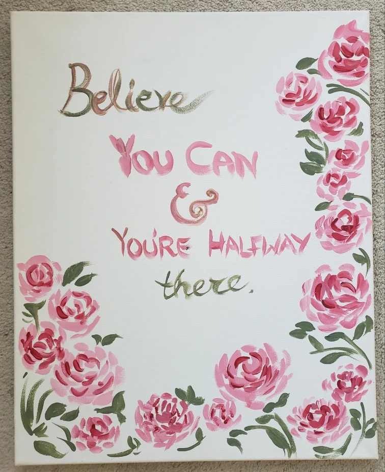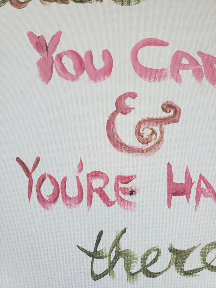 Hand-painted canvas art on white background. Includes a floral border and a quote. Would be perfect to add a little bit of positivity to your space. There is a small hole near the center, negligible to notice as shown in the last few pictures.