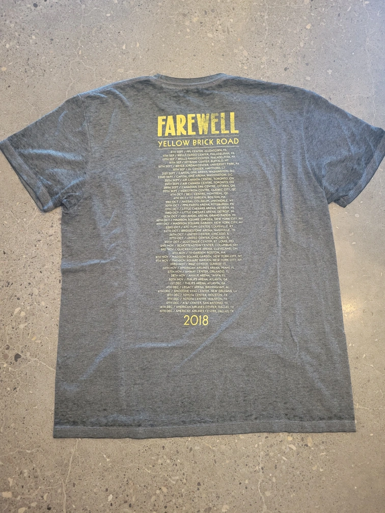 Grey coloured t-shirt with a graphic print of Elton John. Farewell tour dates printed on the back. You could wear this shirt while sitting at home, enjoying a nice glass of wine after a long day.
