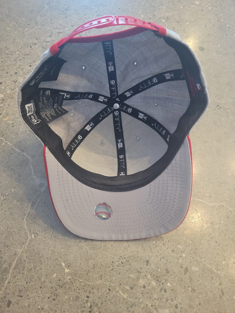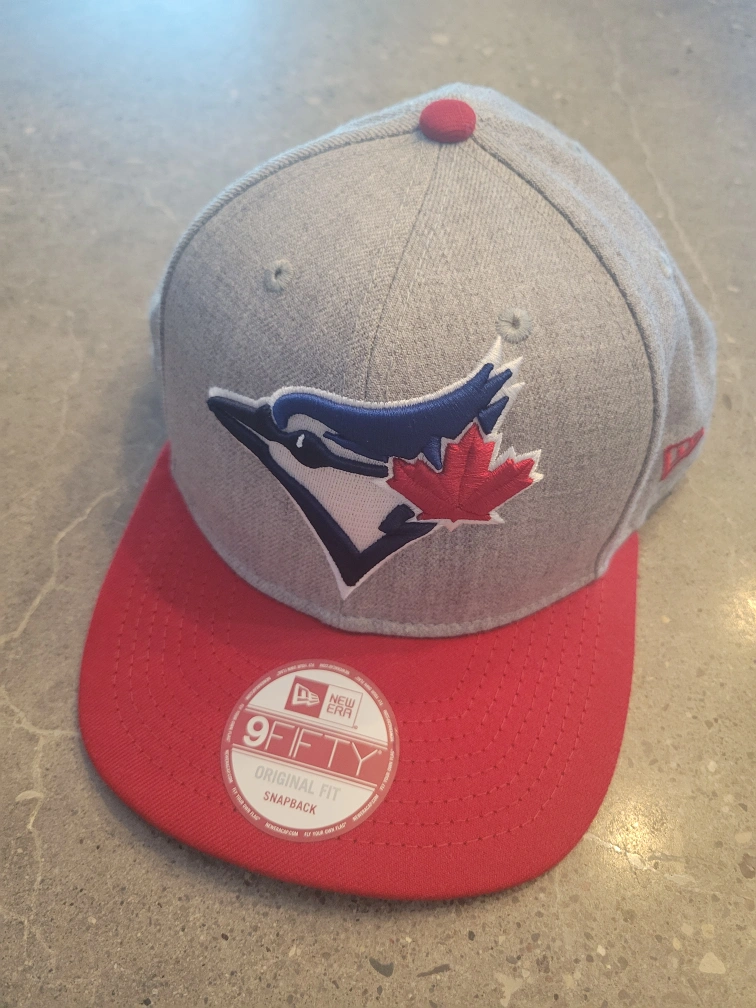 A baseball cap. Features the Blue Jays logo on the front. The bill is red. An amazing item for outdoor enjoyment.