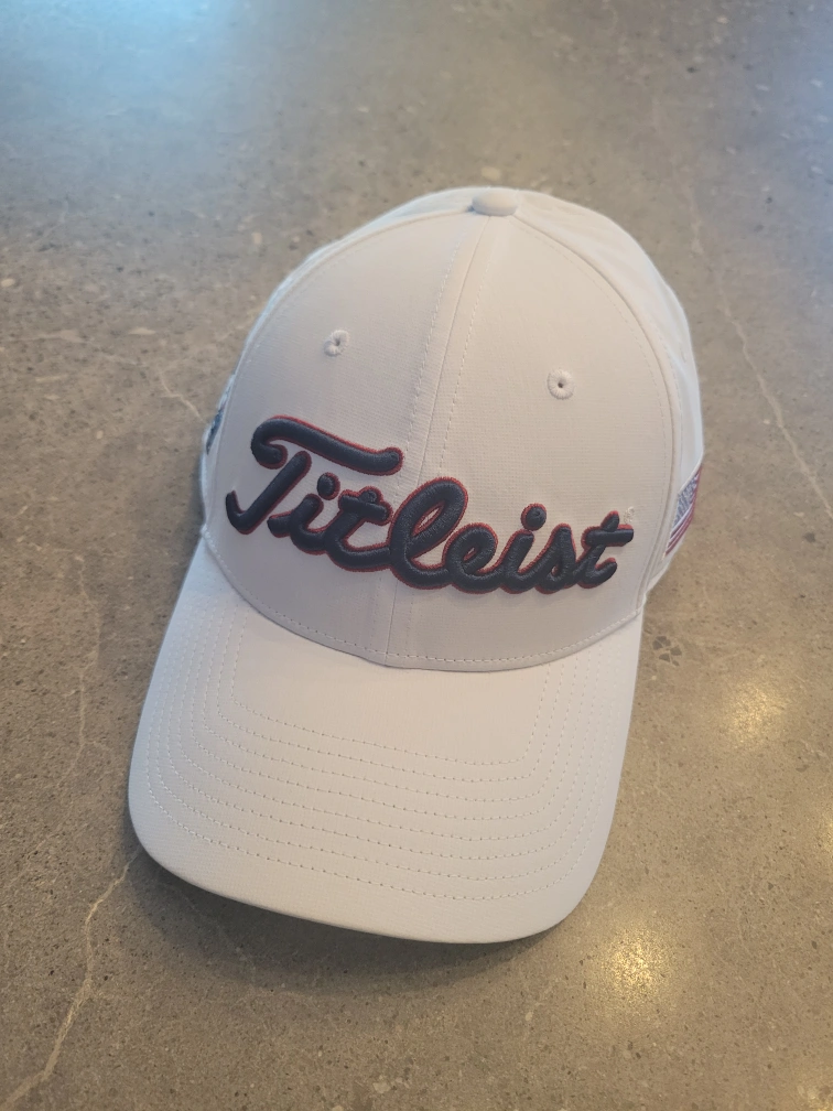 A Titleist golf cap. The cap is white. The brand's logo is embroidered on the front. The cap appears to be a good item to wear while you enjoy a walk on the green.