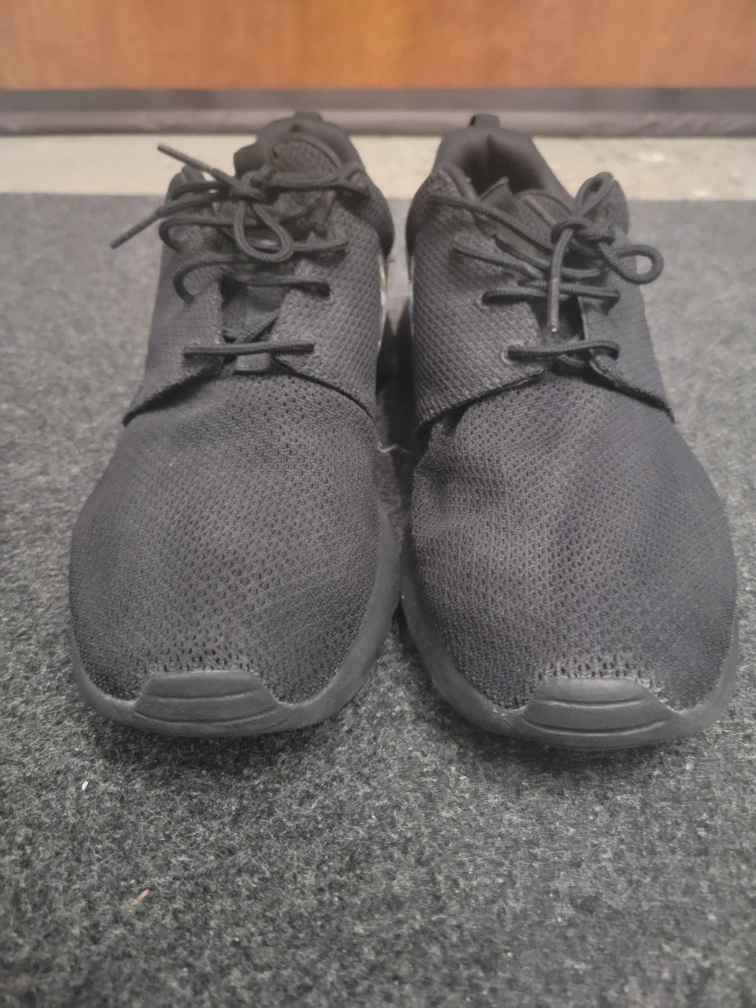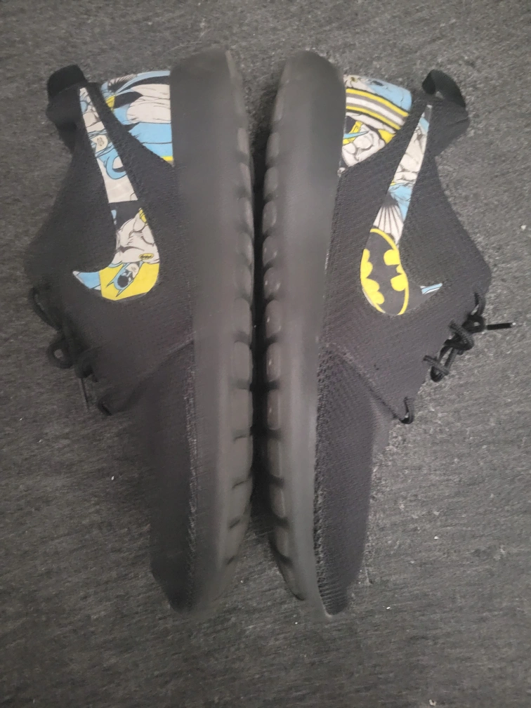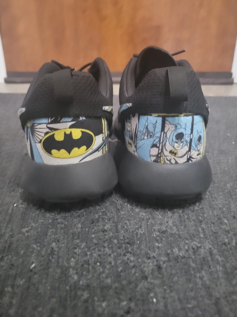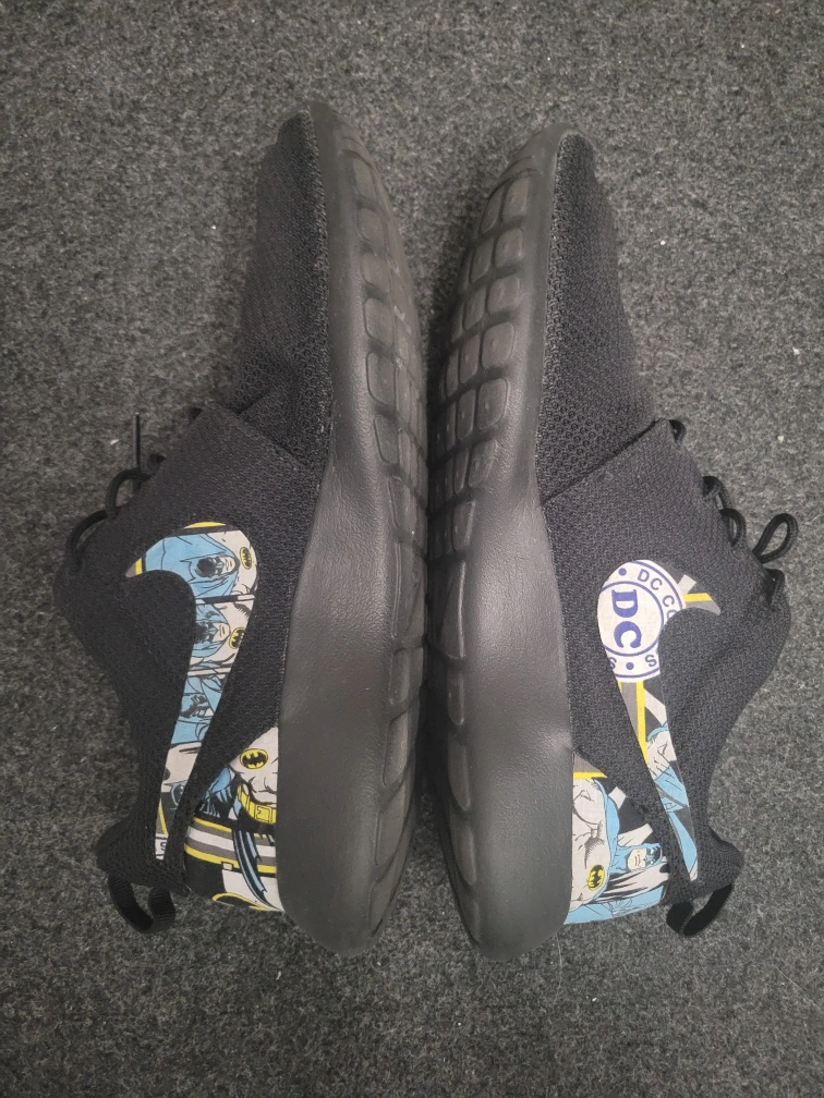A pair of custom black sneakers. Batman is featured on the sides. The soles are black. You can easily wear these while you take a walk through the park.
