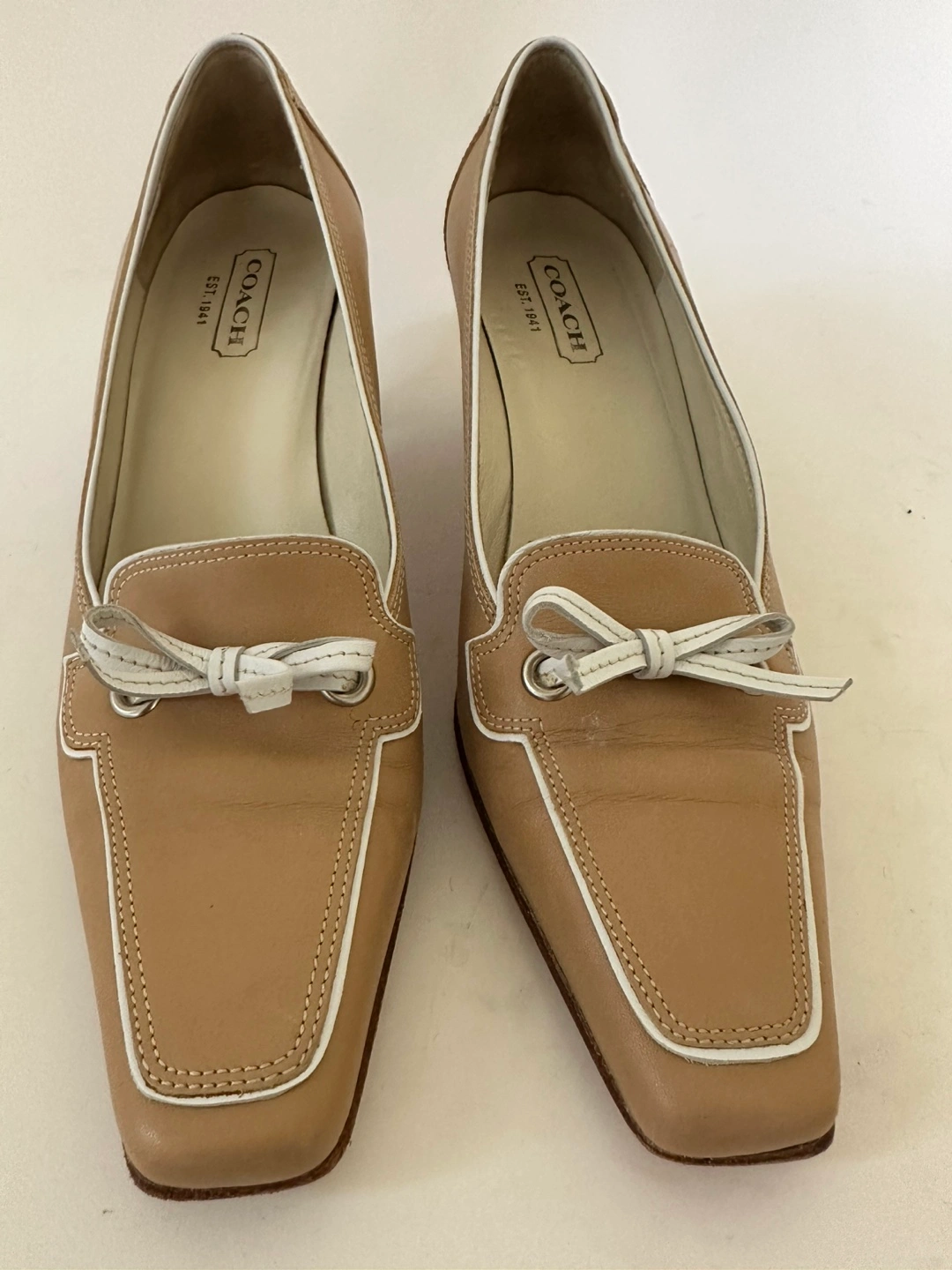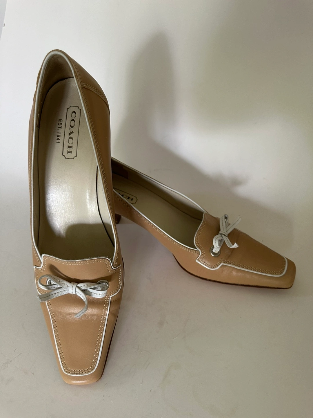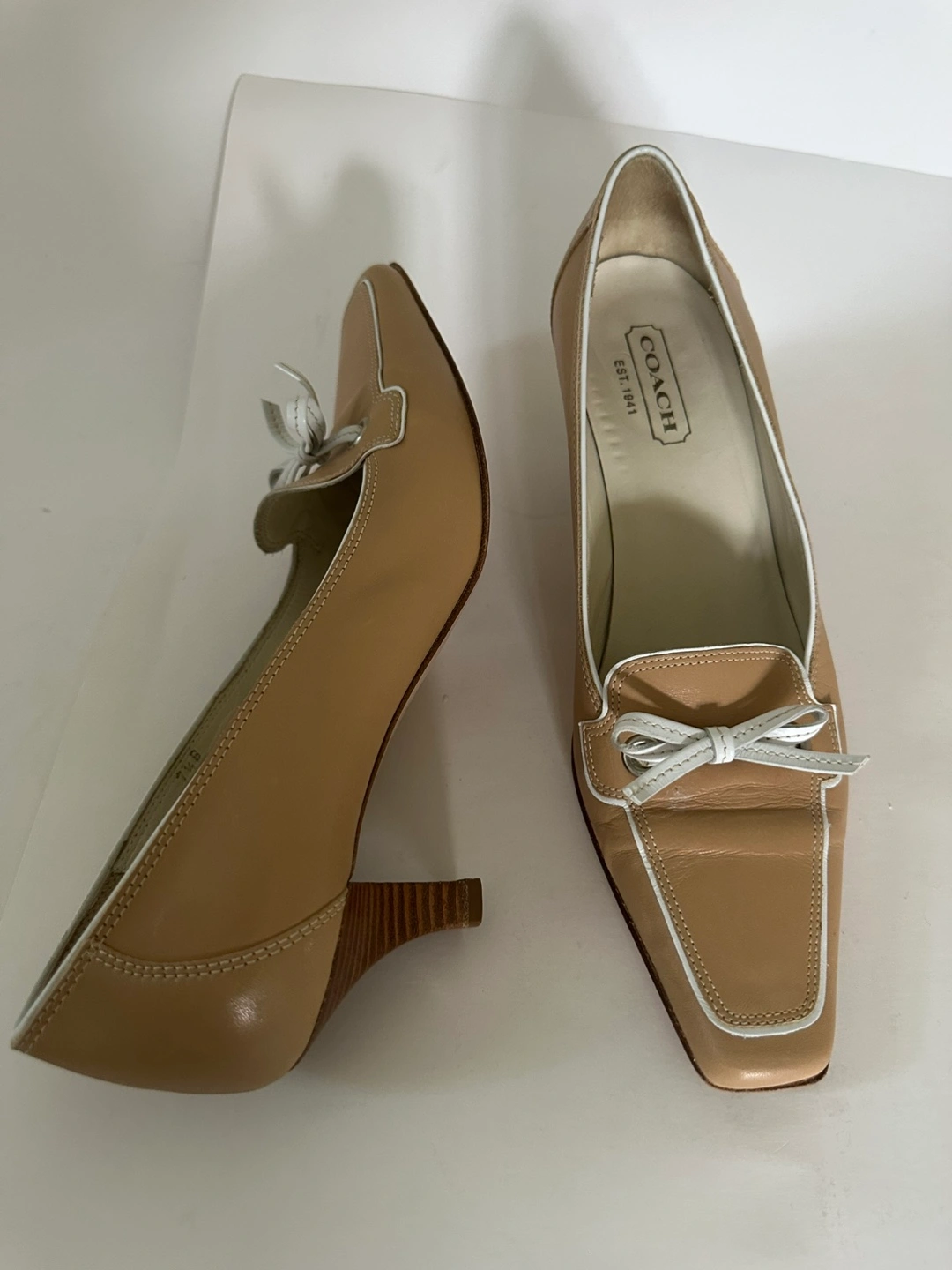 Excellent used condition These elegant Coach Marcella kitten heels feature a bow, a low wooden heel, and a square toe. They have white piping and a light tan leather exterior. From a smoke free pet free home. Pick up in Alta Vista.