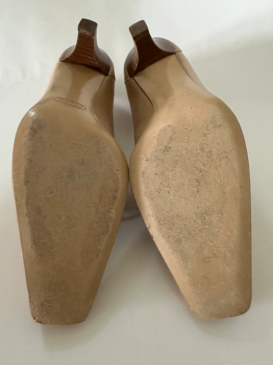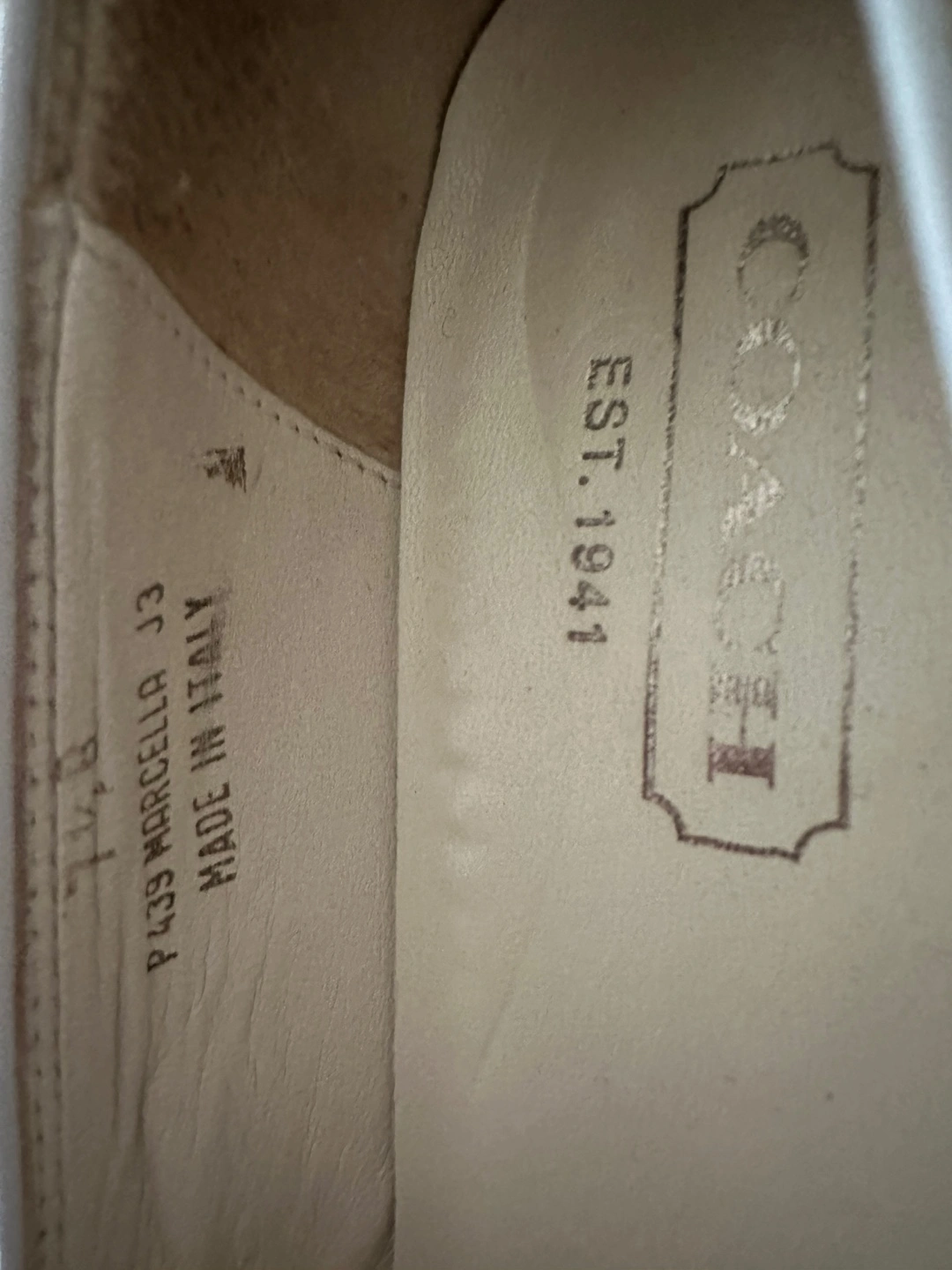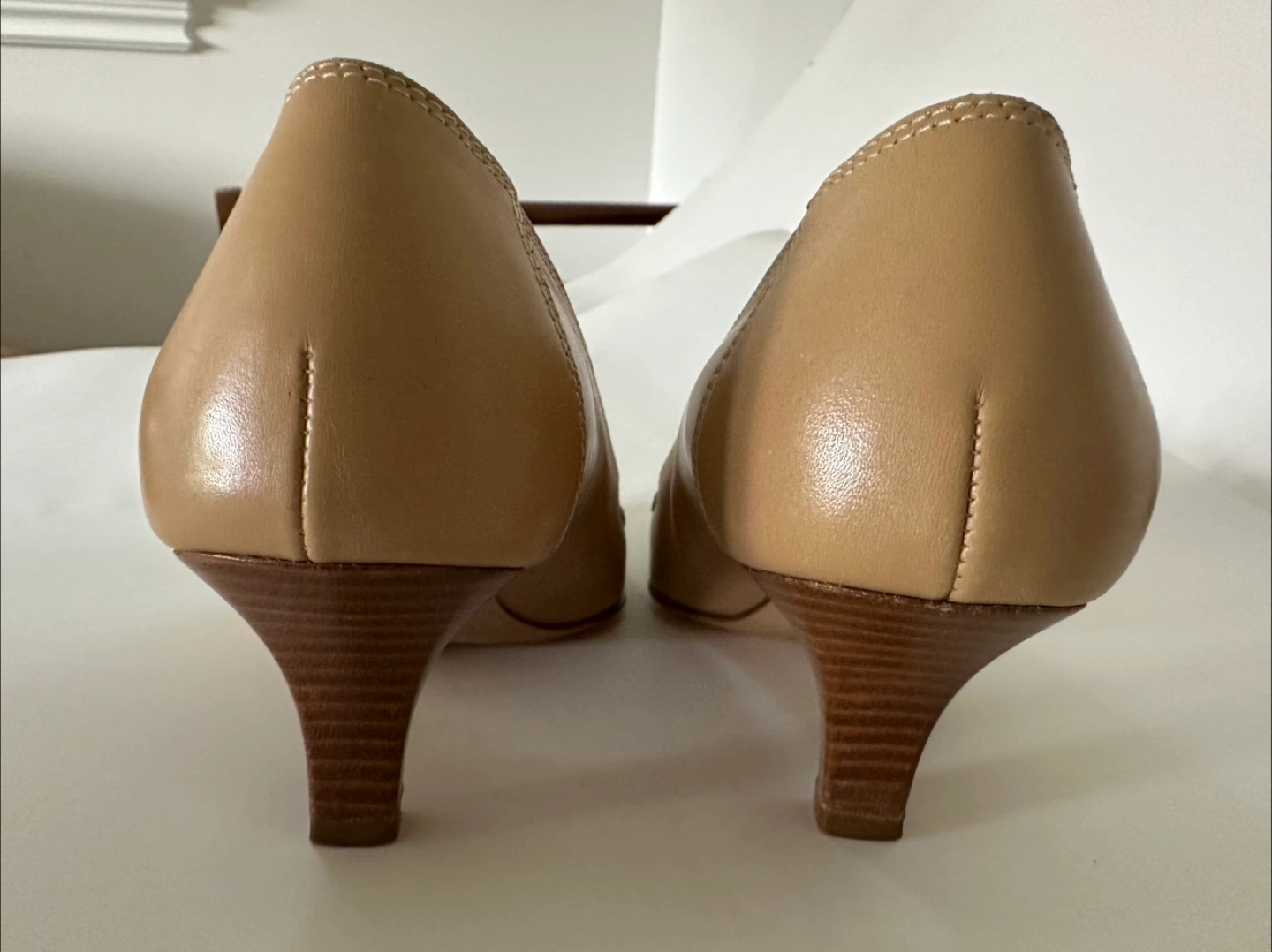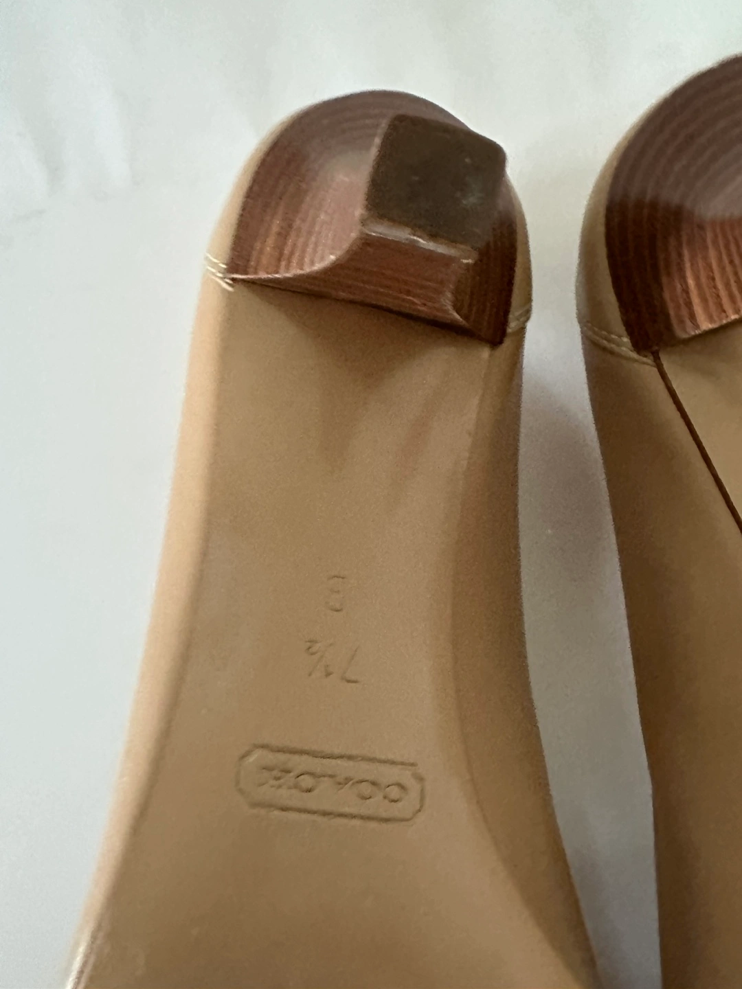 Excellent used condition These elegant Coach Marcella kitten heels feature a bow, a low wooden heel, and a square toe. They have white piping and a light tan leather exterior. From a smoke free pet free home. Pick up in Alta Vista.