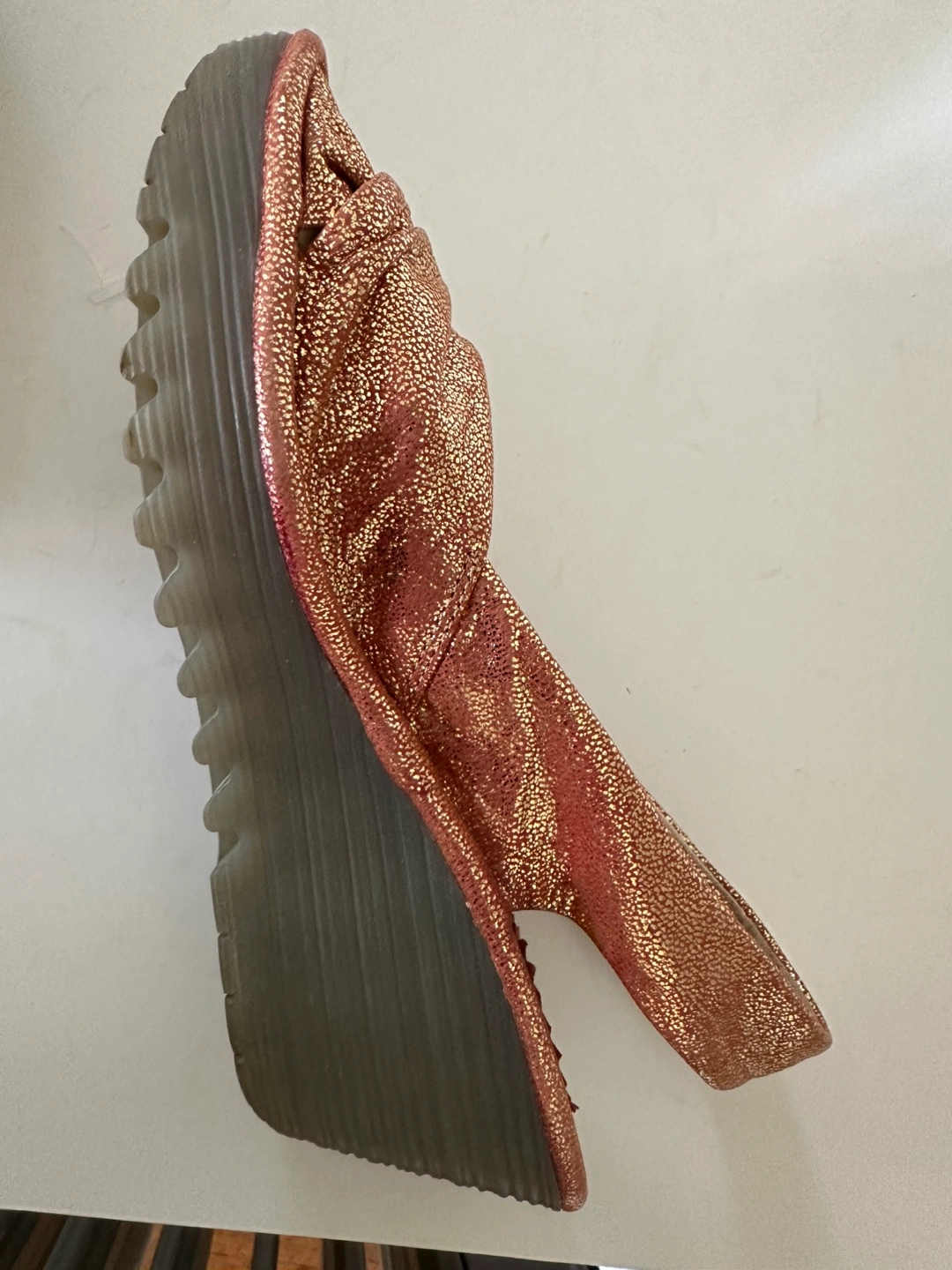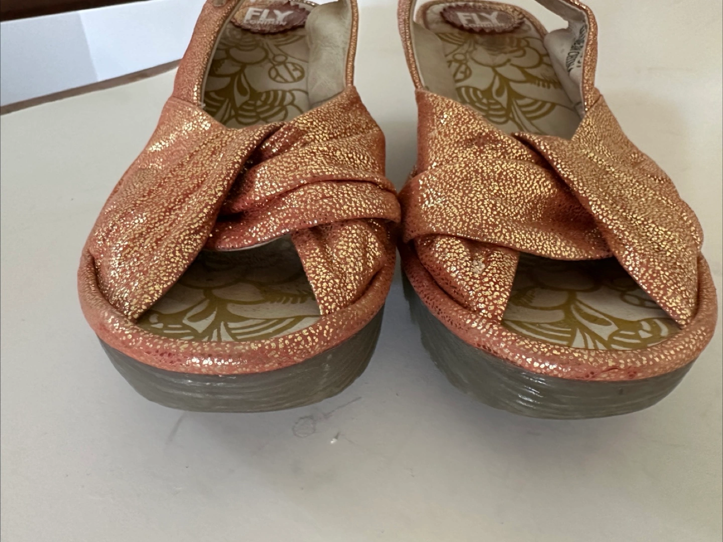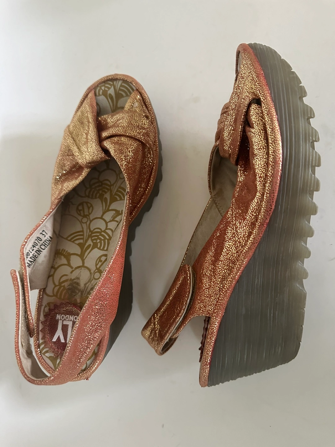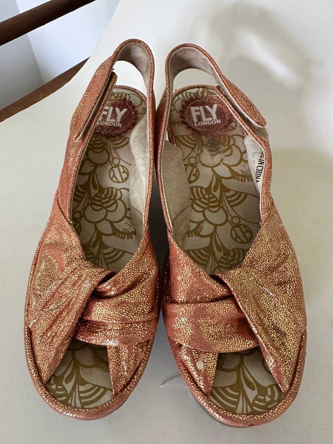 I am selling these leather gold and pink Fly London sandals. They feature a Velcro strap closure , a woven front and a sturdy rubber wedge heel. Great for a night out. From a smoke free, pet free home. Pick up in Alta Vista. These shoes have been meticulously cleaned and sanitized.