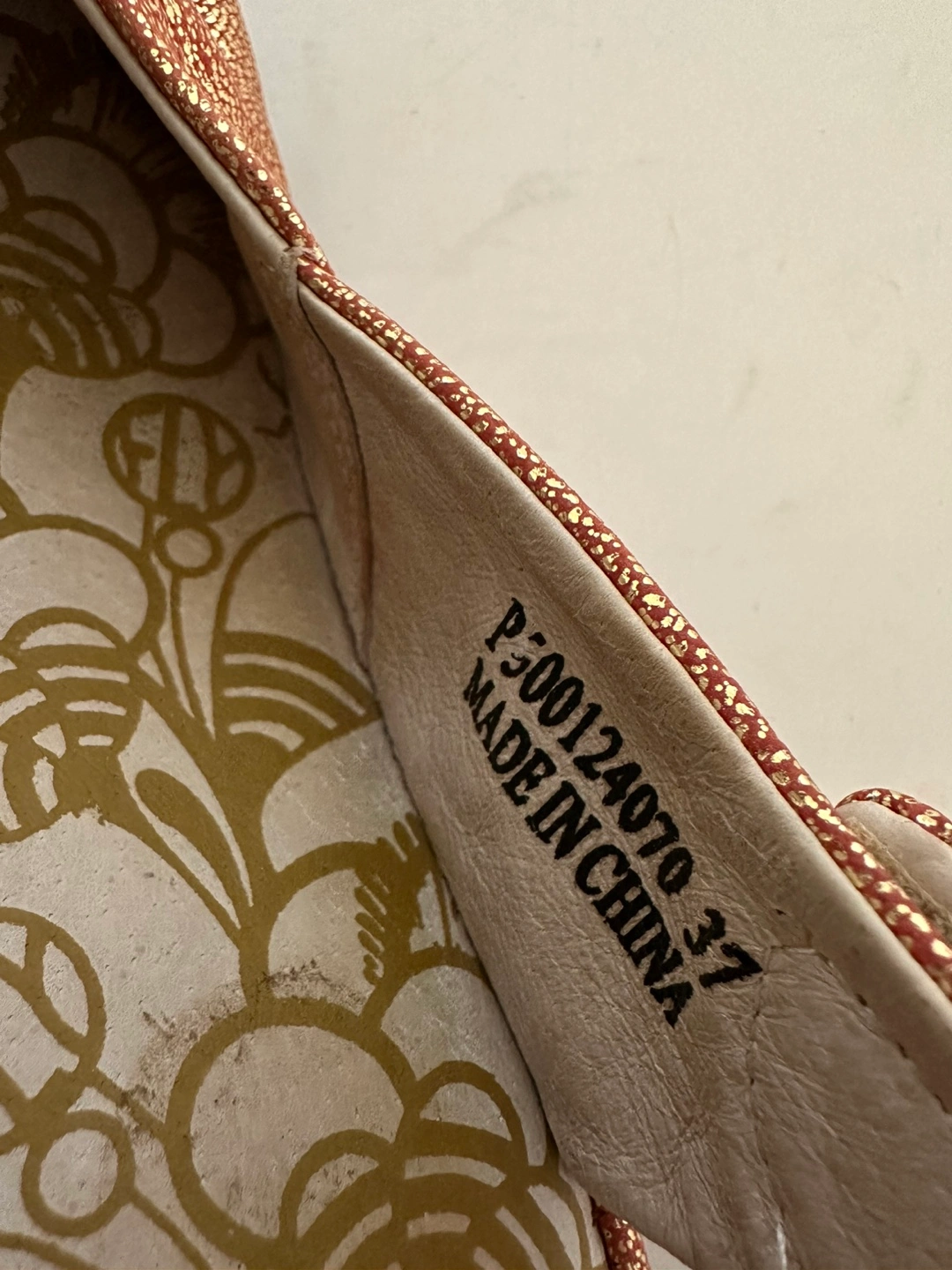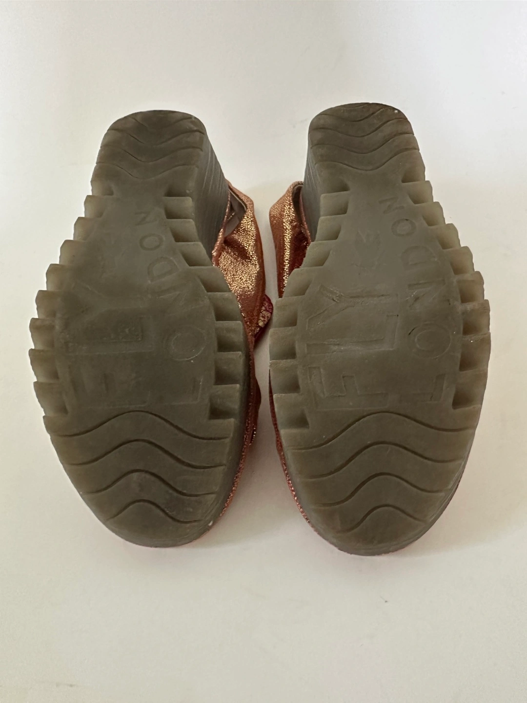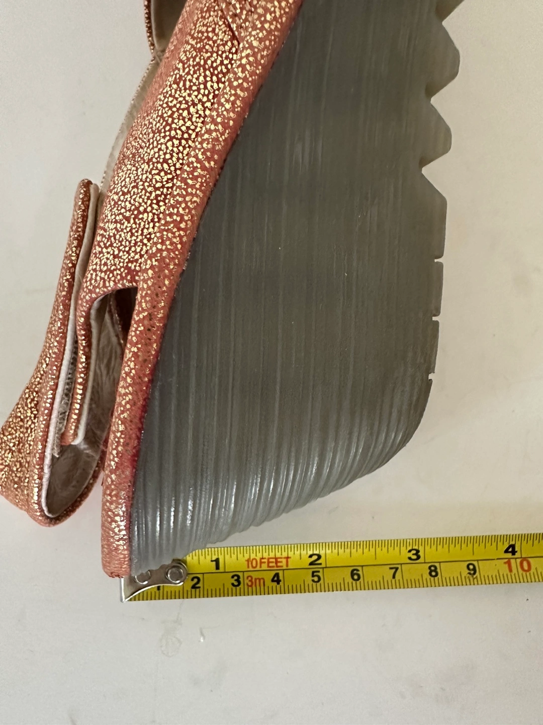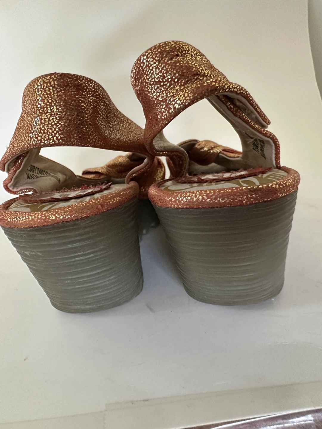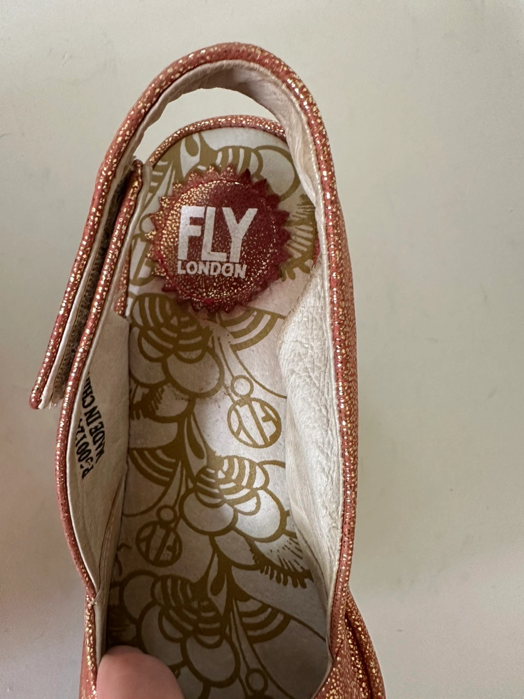 I am selling these leather gold and pink Fly London sandals. They feature a Velcro strap closure , a woven front and a sturdy rubber wedge heel. Great for a night out. From a smoke free, pet free home. Pick up in Alta Vista. These shoes have been meticulously cleaned and sanitized.