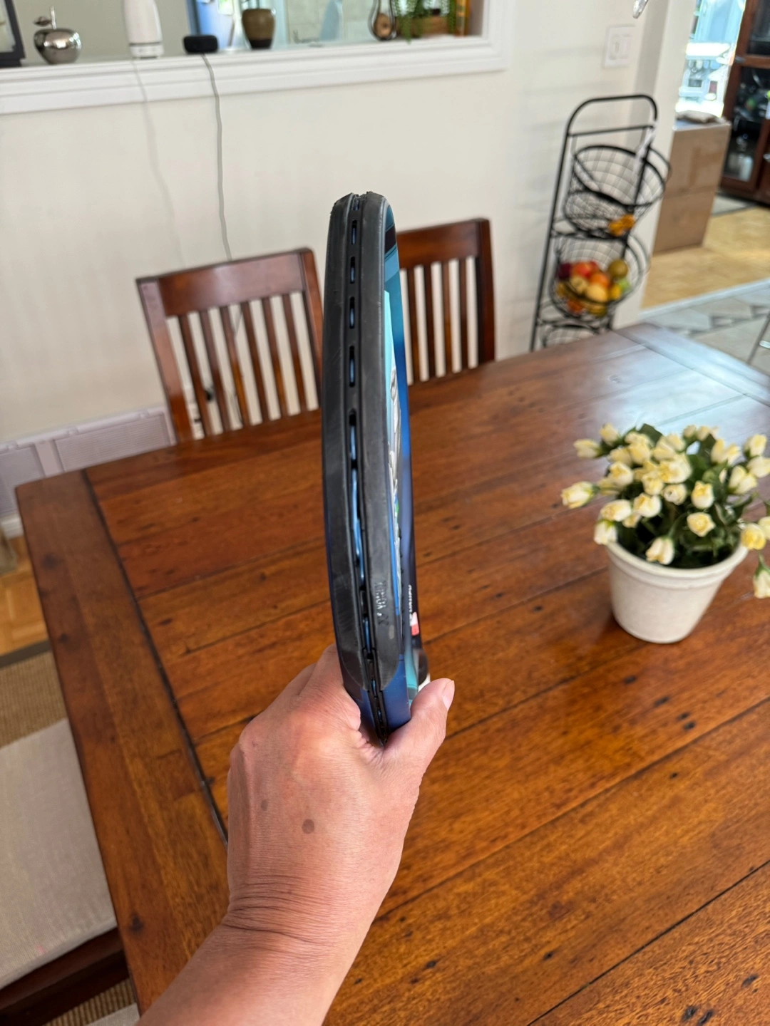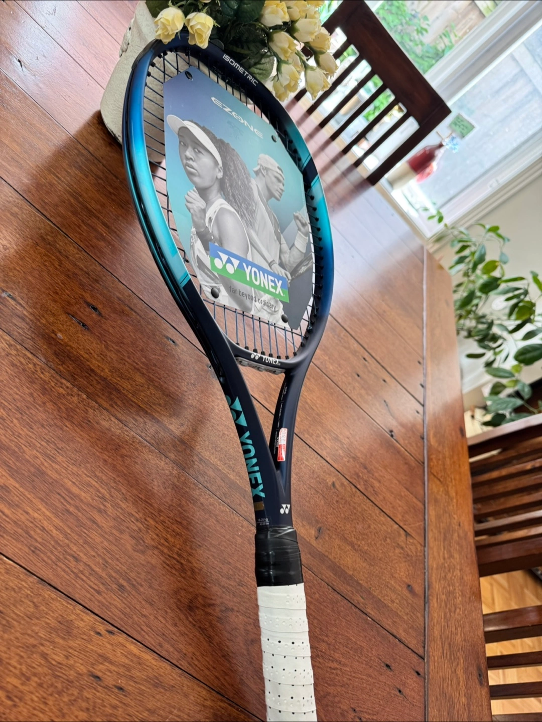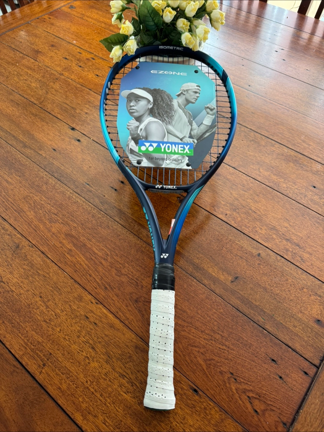 Tennis Racquet 2 months old used three times , The Yonex EZONE Feel is a lightweight, comfortable, and powerful tennis racquet designed for a wide range of players. Head Size: 102 sq. in. / 658 sq. cm. Length: 27 inches / 68.5 cm. Weight: 8.8 oz / 250 g (unstrung). Balance: 2 pts head heavy / 350 mm (unstrung). String Pattern: 16x18. Composition: HM Graphite, Nanocell Neo, VDM. Beam Width: 24 mm / 27 mm / 22 mm. Recommended String Tension: 40-55 lbs. Grip: Yonex Synthetic. Re layered with breathable nonslip grip. Swingweight: 298. Flex: 68.