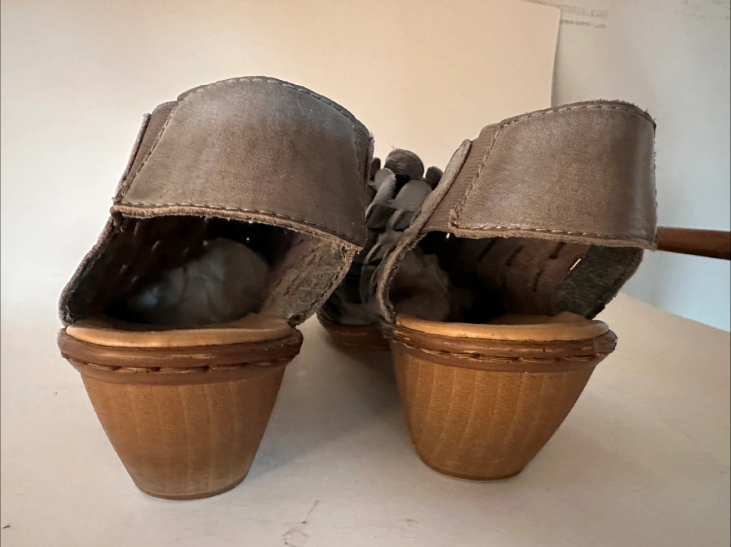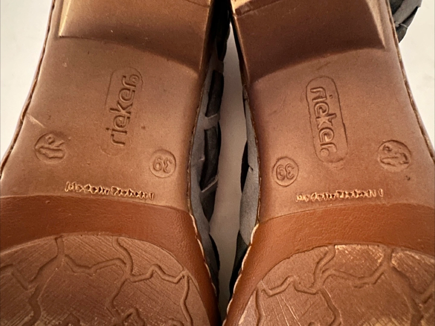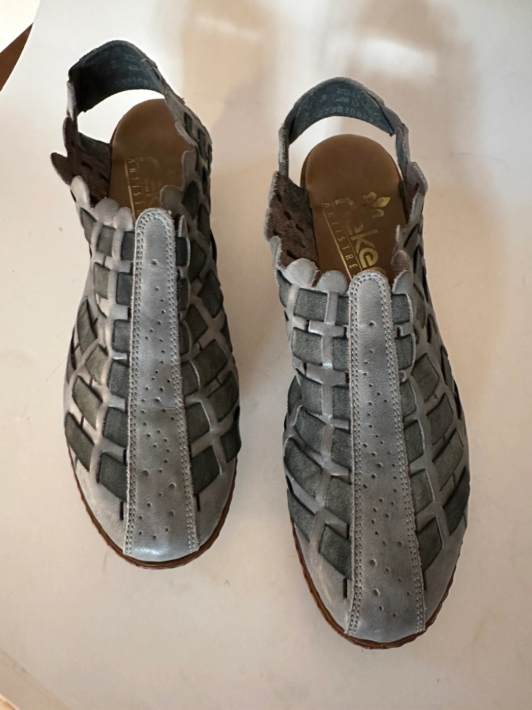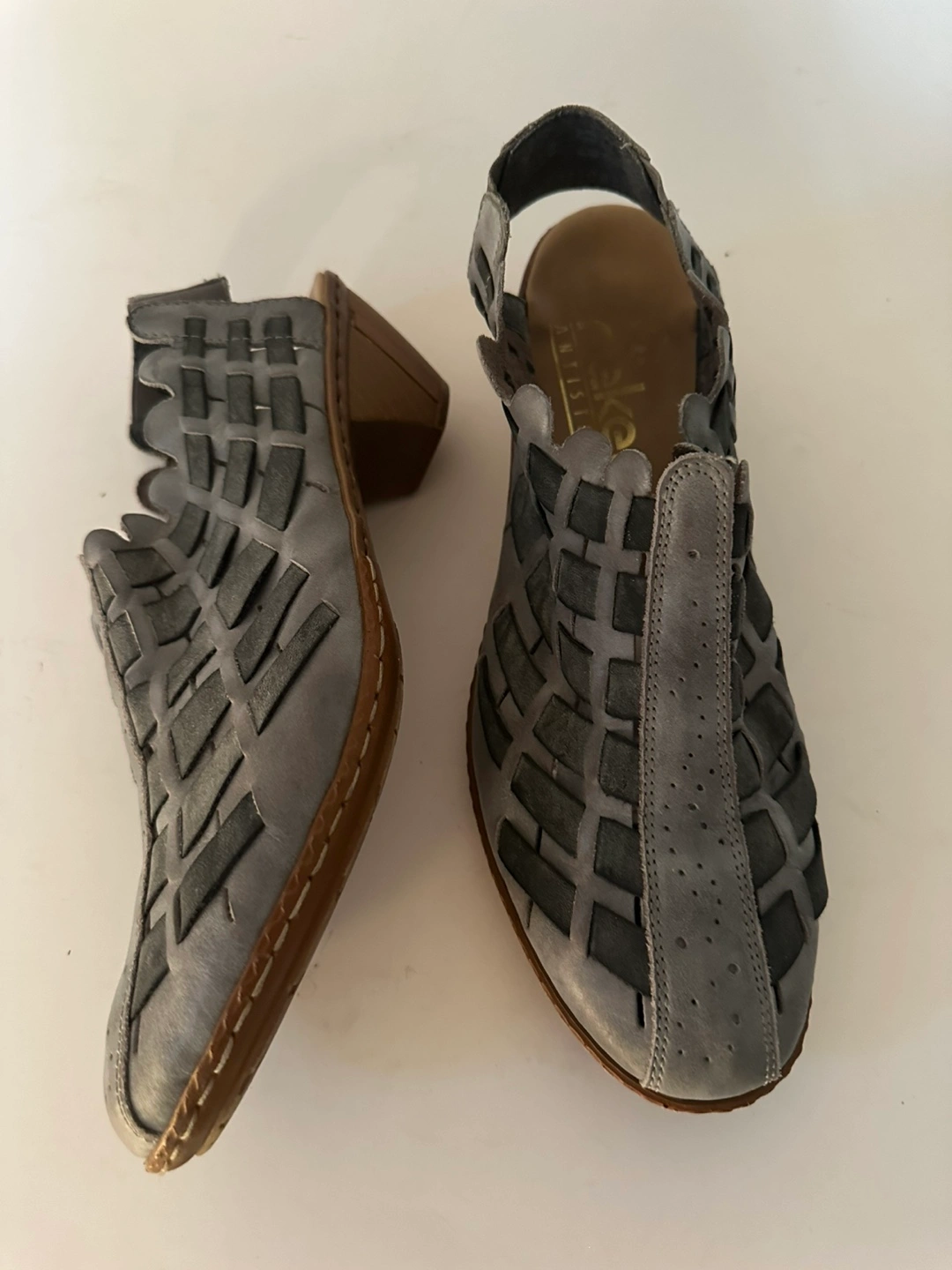 Preloved in good condition. These Rieker grey woven slingback sandals feature a low heel and a unique woven design. The insole is brown and soft, the soles are textured. These sandals are perfect for a relaxed walk on a summer day. They have been cleaned and sanitized. From a smoke free, pet free home. Pick up in Alta Vista.