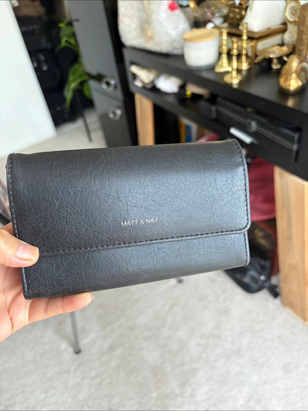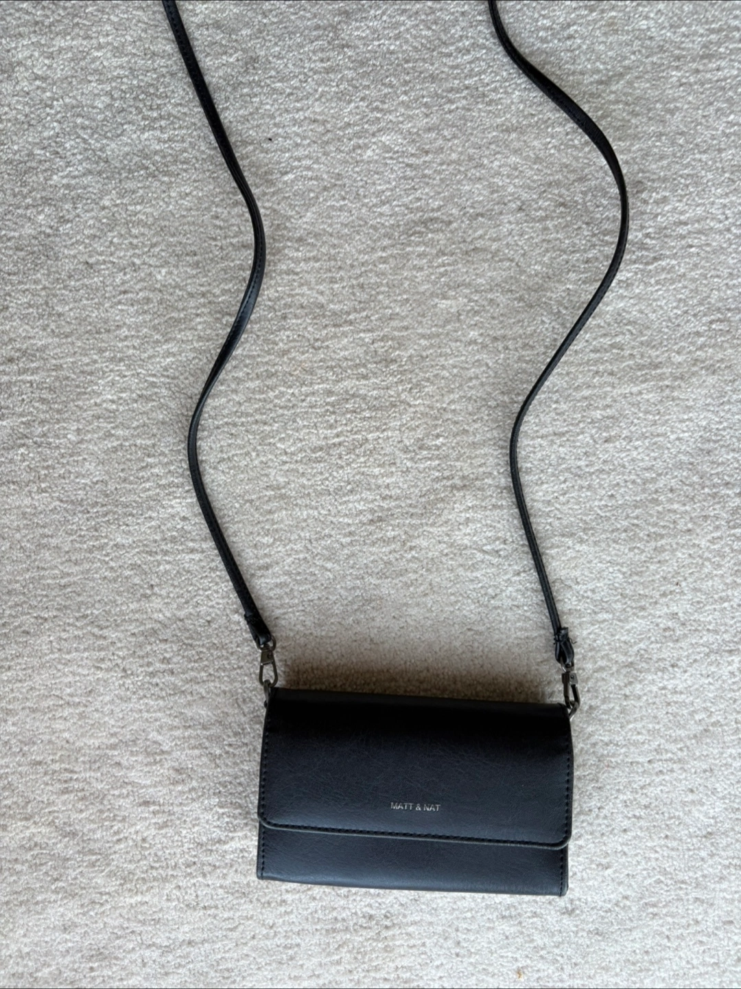 Black bag. Flap closure. Metal details. making it a good choice when you only want to bring your phone with you.small size