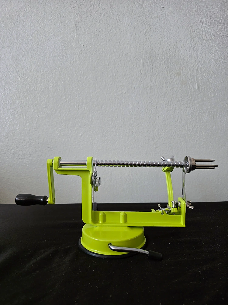 A great addition to your kitchen. Features a hand crank. Includes a vacuum base. Has adjustable peeling and slicing capabilities. You might find peeling apples with this item a very relaxing experience. From Pet Free | Smoke Free Home ๐ Wellesley and Sherbourne