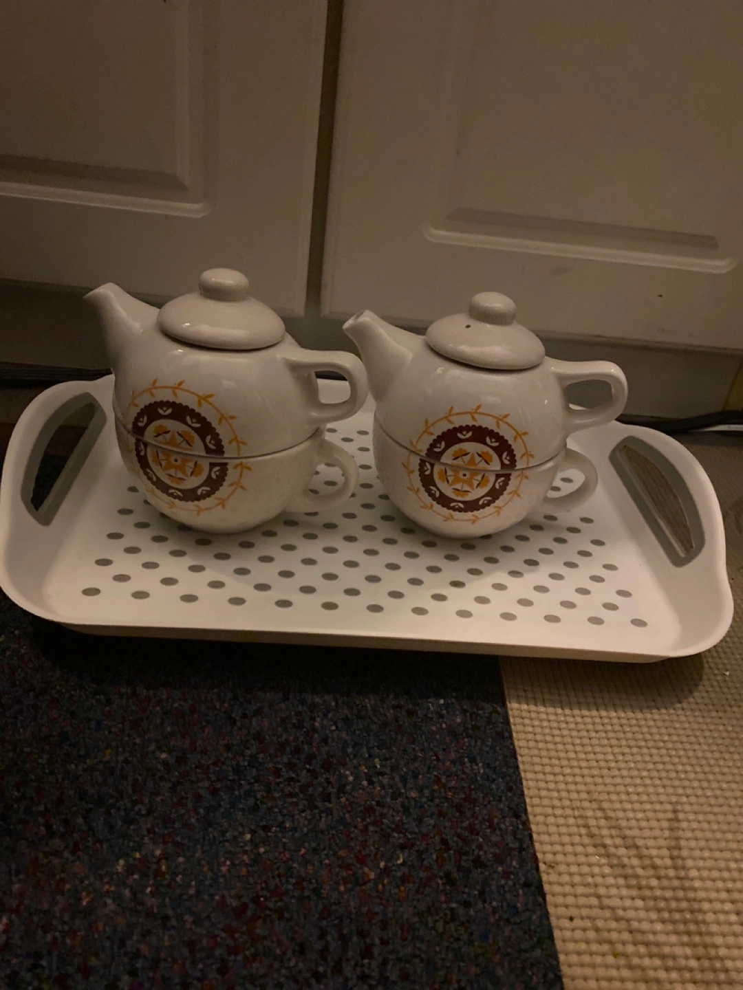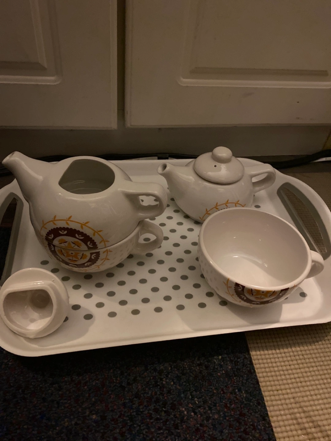 Matching teapot and cup set. Decorated with patterned details. Set includes two teapots with lids, two cups, and a serving tray. Makes a great self-care item to use while you unwind after a long day.