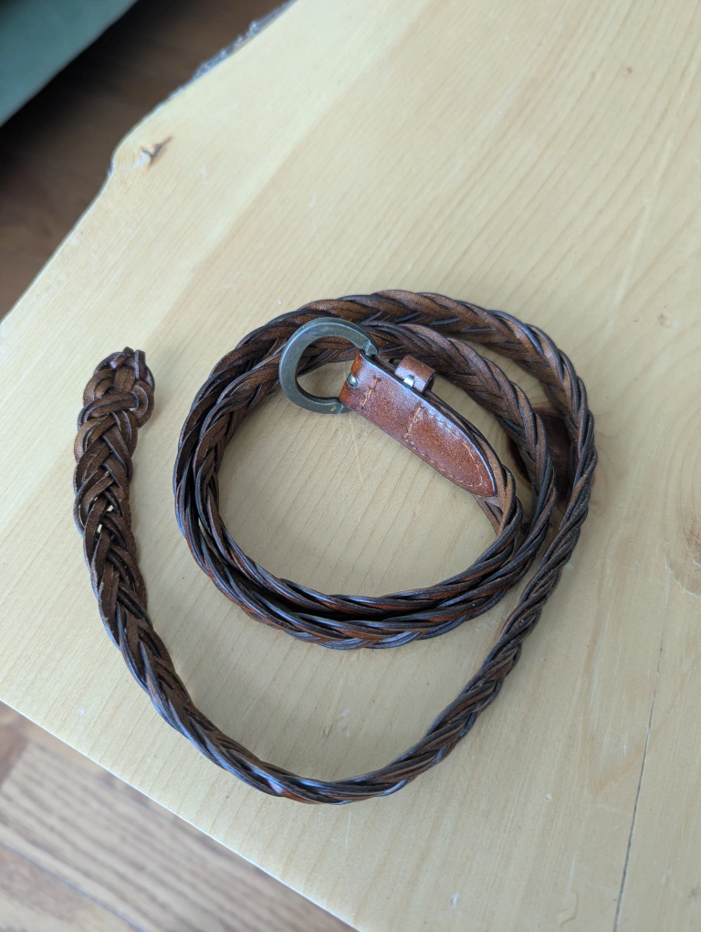 Brown leather belt of around 40 inches. Braided design allows you to tighten anywhere. Only available for pick up.