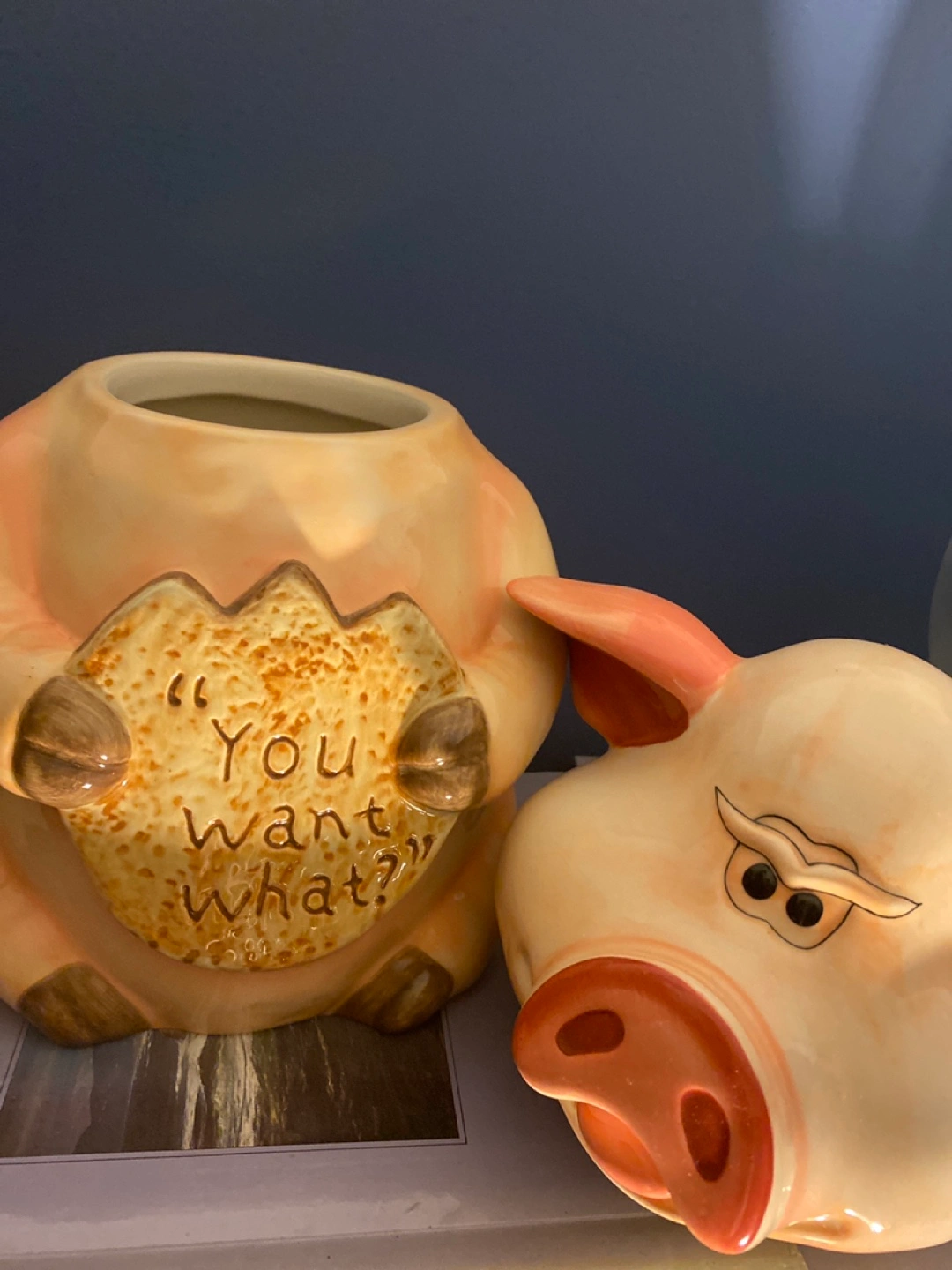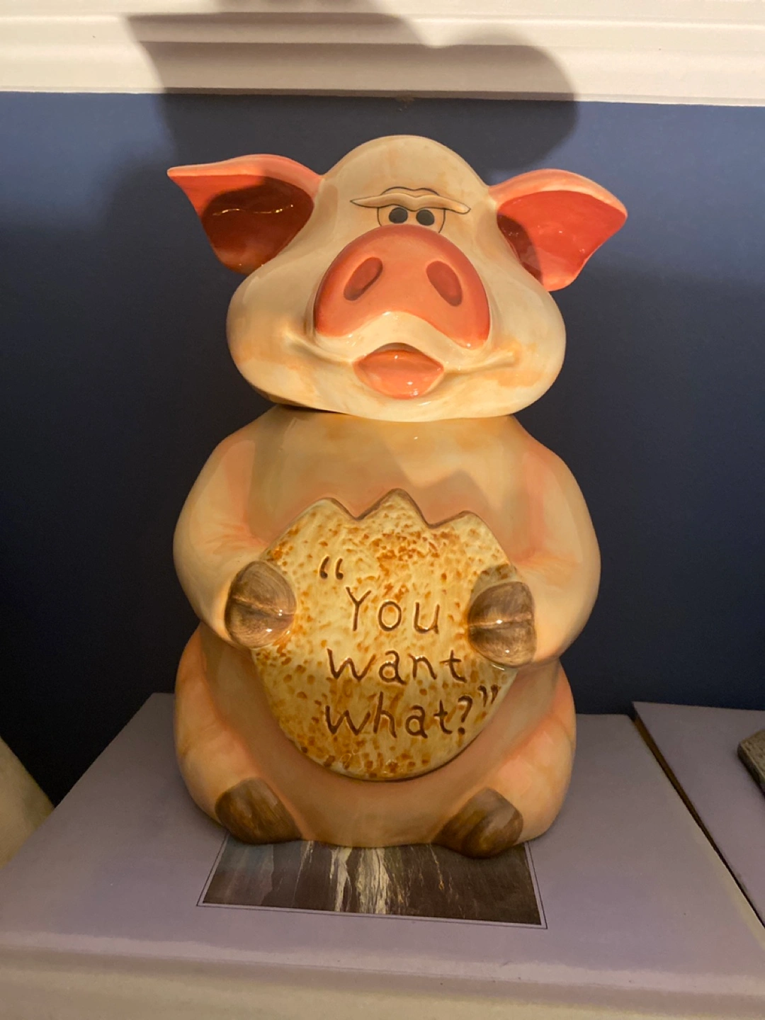 A pig-shaped cookie jar. The jar is holding a cookie. On the cookie are the words "You want what?". Two parts. A cute piece for your kitchen. Enjoying this cookie jar is a wonderful way to relax and enjoy some tasty treats.