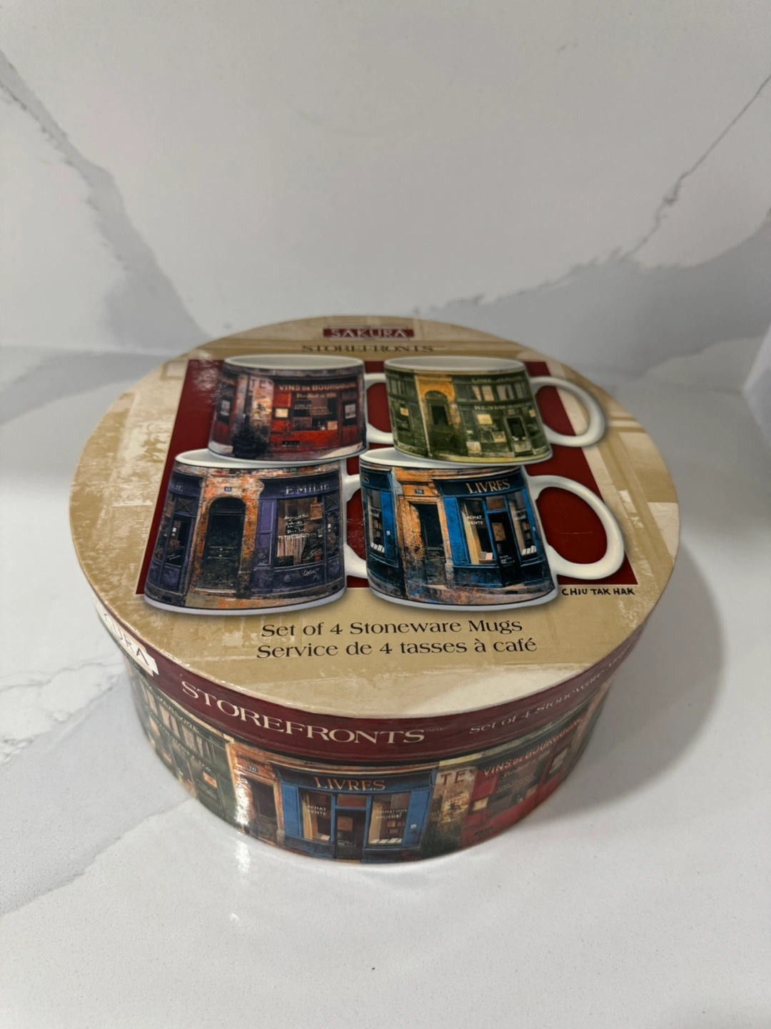 A lovely set of four stoneware mugs. Mugs appear to be in the shape of storefronts. Comes with the original container. Imagine enjoying your morning coffee with these mugs in hand, relaxing as you start your day. Pick up at Steeles & Bathurst area.