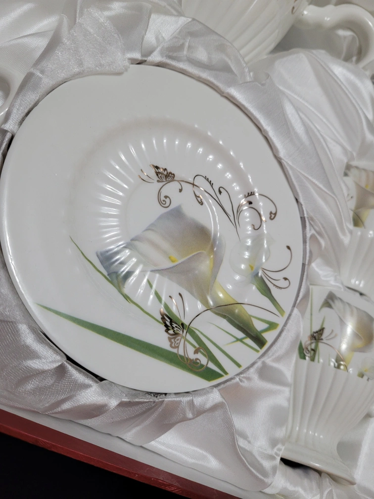 Complete Fine Porcelain tea set includes cups, saucers, and a tea pot. Cups and tea pot feature a gorgeous floral design. Set is beautifully packaged in a red box, and has never been used. Pick up only, Don Mills and York Mills area.