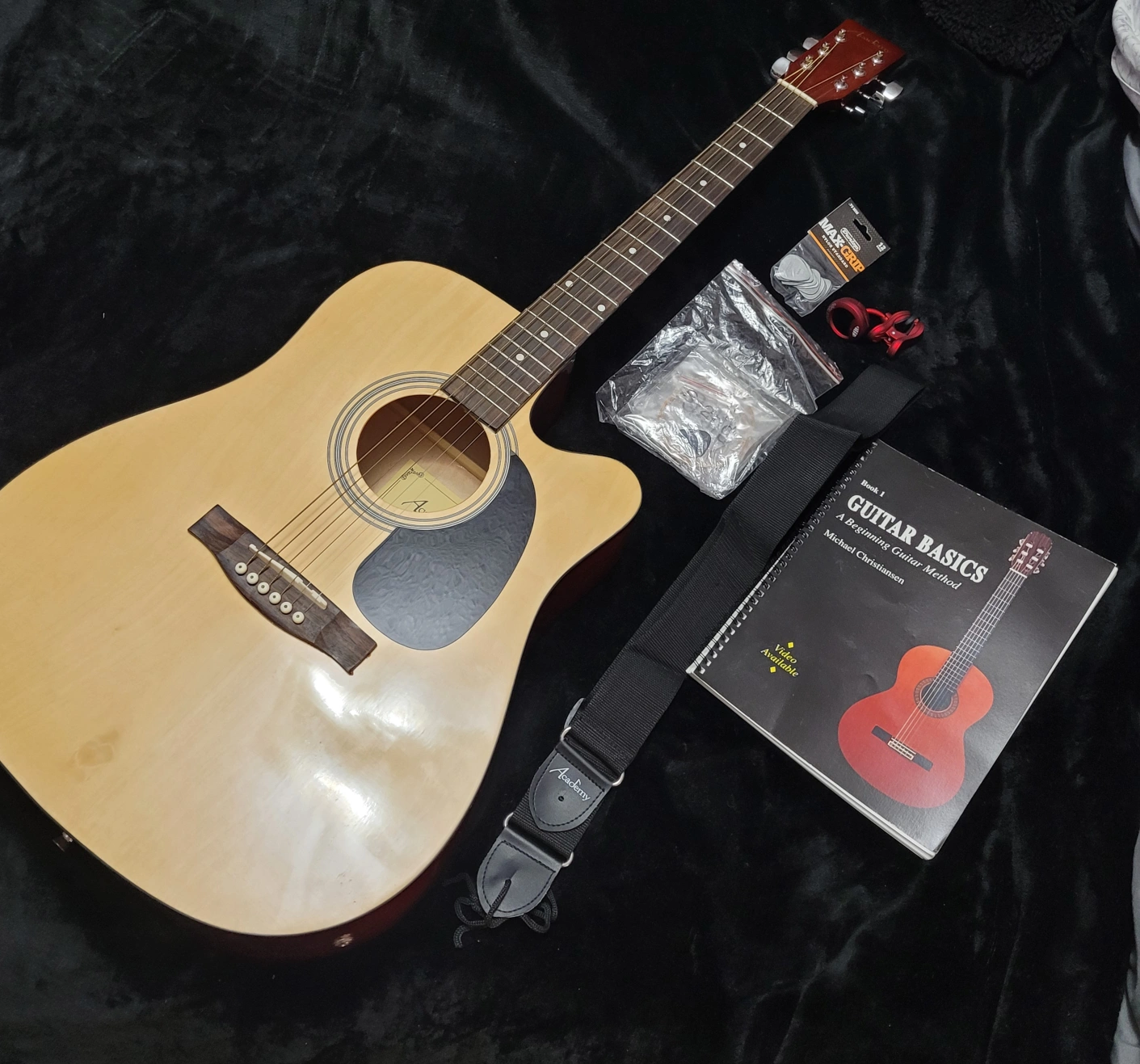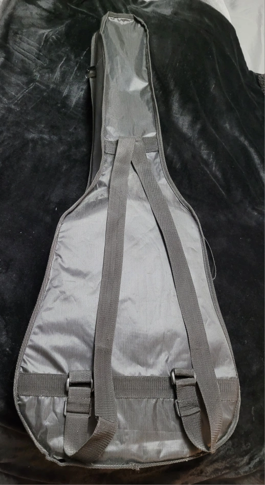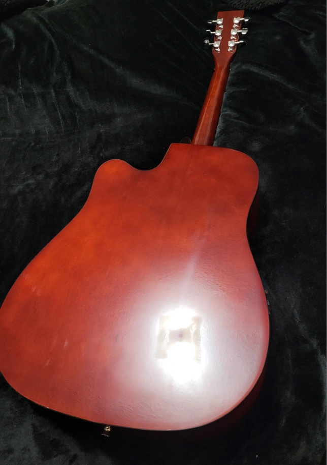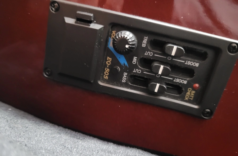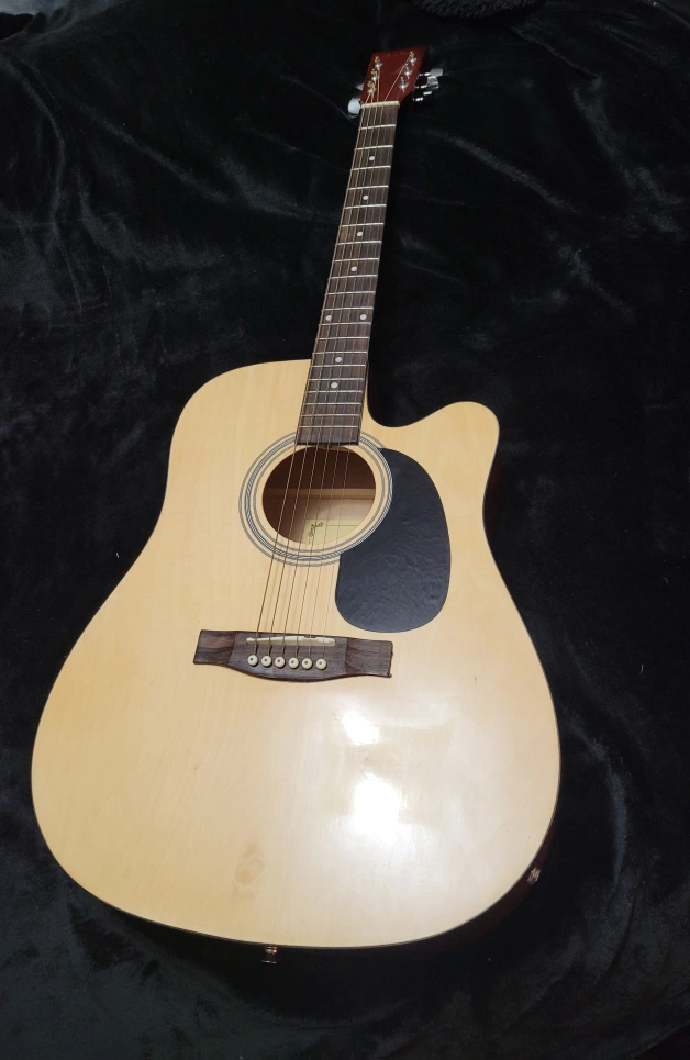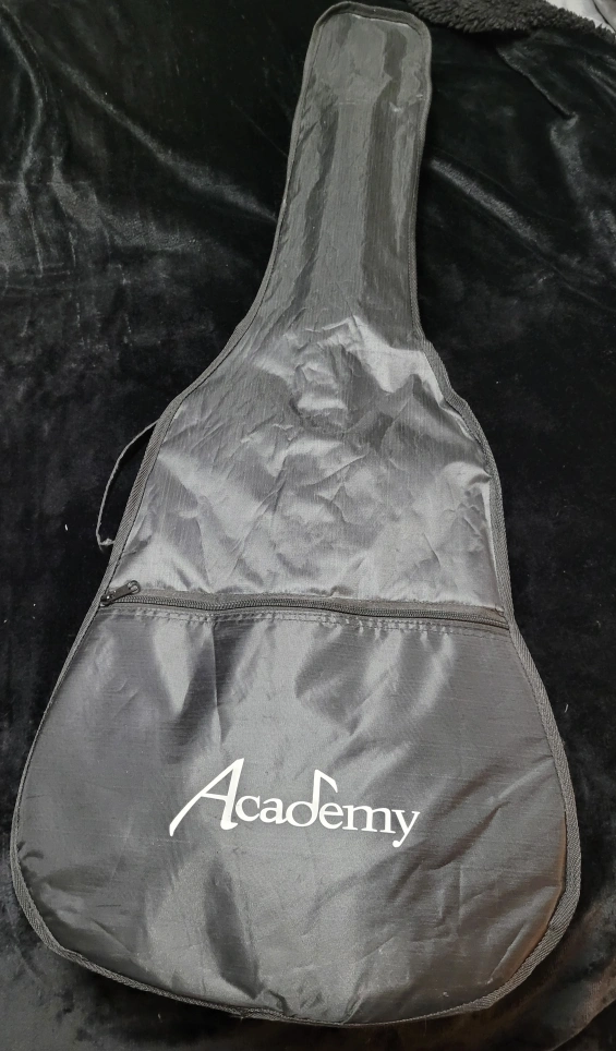 Acoustic guitar with light wooden front and cherry wooden back. Included are accessories such as a strap, new tuner, picks, extra strings and a learning guide. Comes in a double-strap backpack-type of carrying bag. This line of guitars from Academy are perfect for beginners! This guitar has barely been used, and is in need of someone to love it. In great condition other than a small crack at the back near the base of the handle. The guitar has a Belcat EQ-505 preamp for an acoustic guitar. This device is designed to amplify and modify the sound of an acoustic guitar,allowing for greater control over the tone. Key features of the EQ-505 include: 3-Band Equalization: Controls for Treble, Midrange, and Bass frequencies, allowing for precise adjustments to the guitar's tone. Volume Control: A rotary knob to adjust the overall output volume. C Boost/Cut Sliders: Sliders for each frequency band to boost or cut the signal. Battery Check: A light indicator to show battery status.