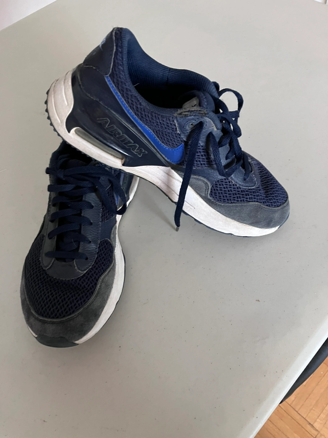 NIKE Size: US 6 Y UK 5.5 EUR 38.5 These sneakers come in a dark blue colour. There are laces to tie. They feature mesh on the top and have a sturdy sole. Put these on and enjoy some comfortable walking time.