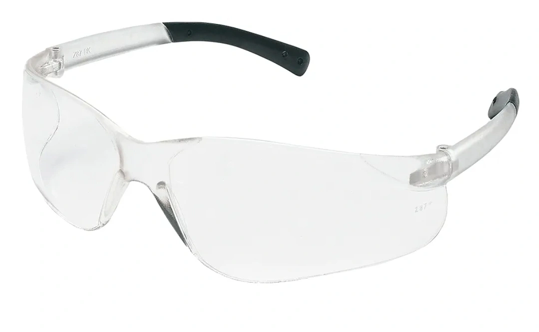 A pair of safety glasses with a clear lens. Features a wrap-around design with black arm tips for extra comfort. These glasses could be used to protect your eyes while working, but could also be used as a fashion accessory.
