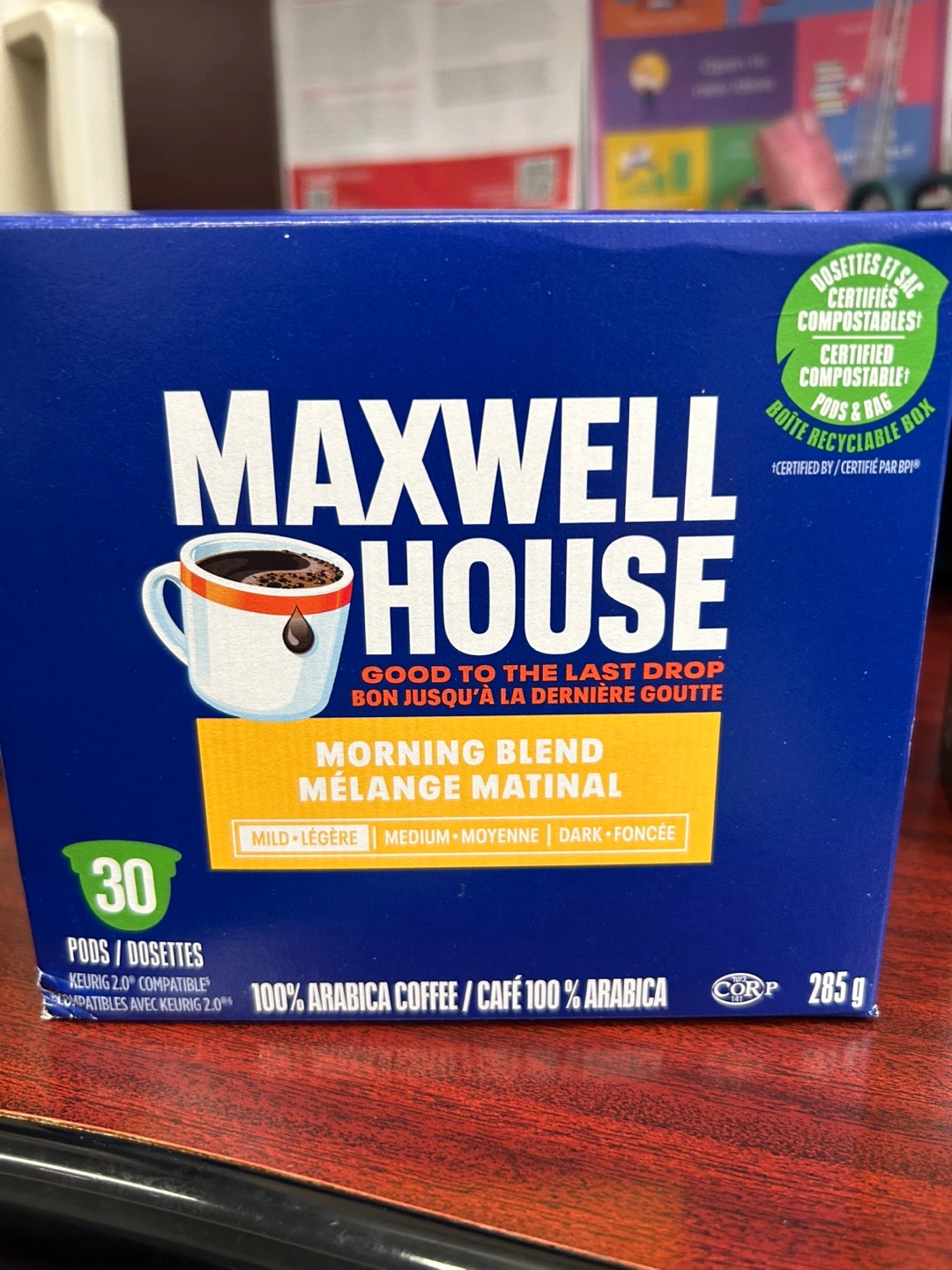 A box with coffee pods, labelled Morning Blend. Featuring a picture of a mug, in a blue box, with some French text. Pouring a cup of this coffee can create a moment of relaxation.