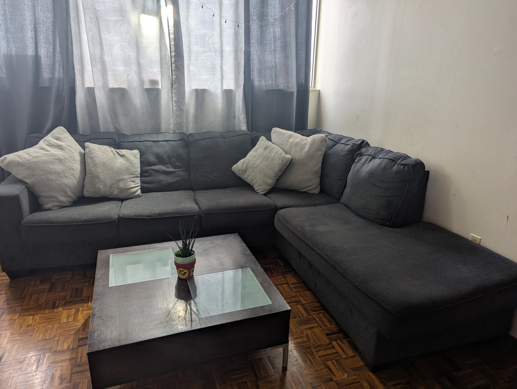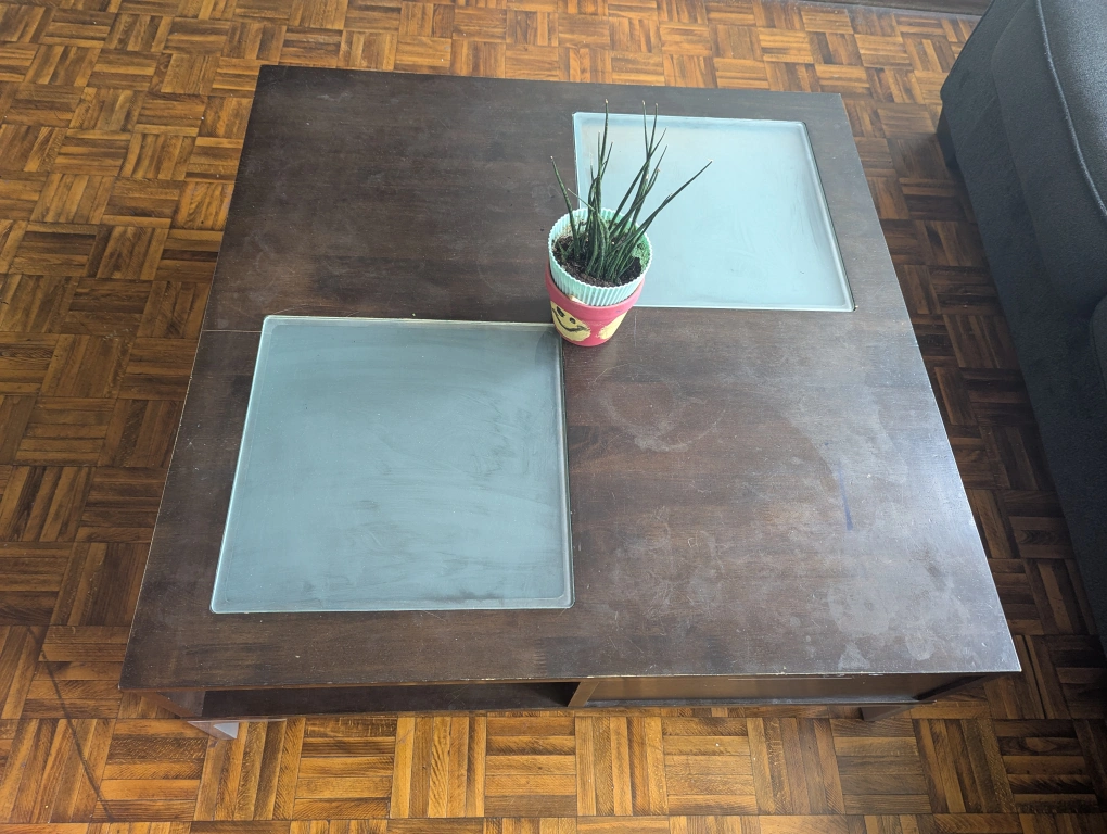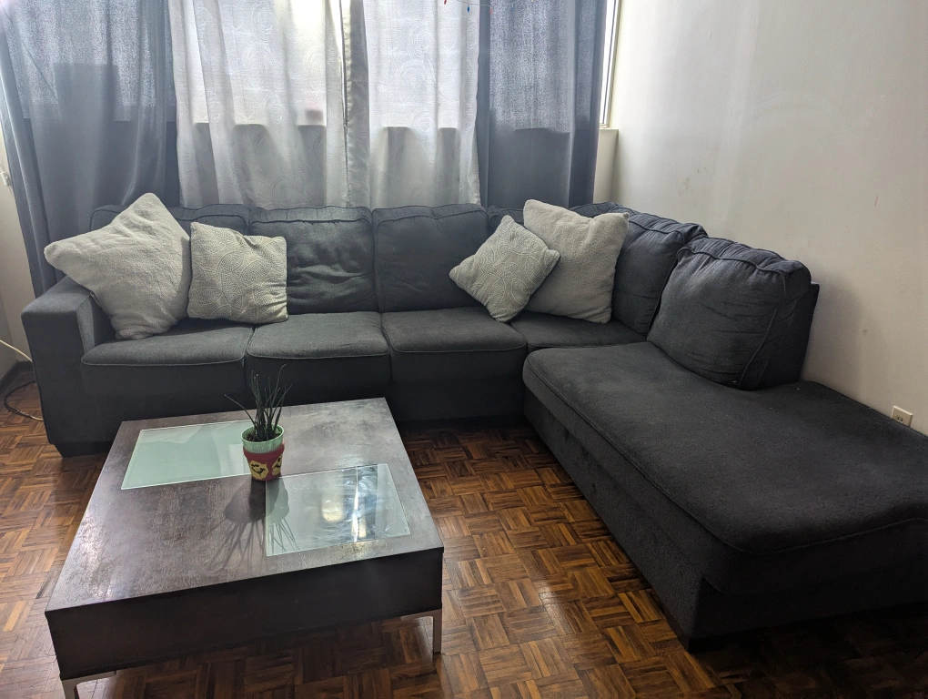 Dark grey sectional sofa. Complete with a matching dark wood coffee table. Sectional features a chaise lounge. Coffee table with two frosted glass inserts. A great addition to your living space.