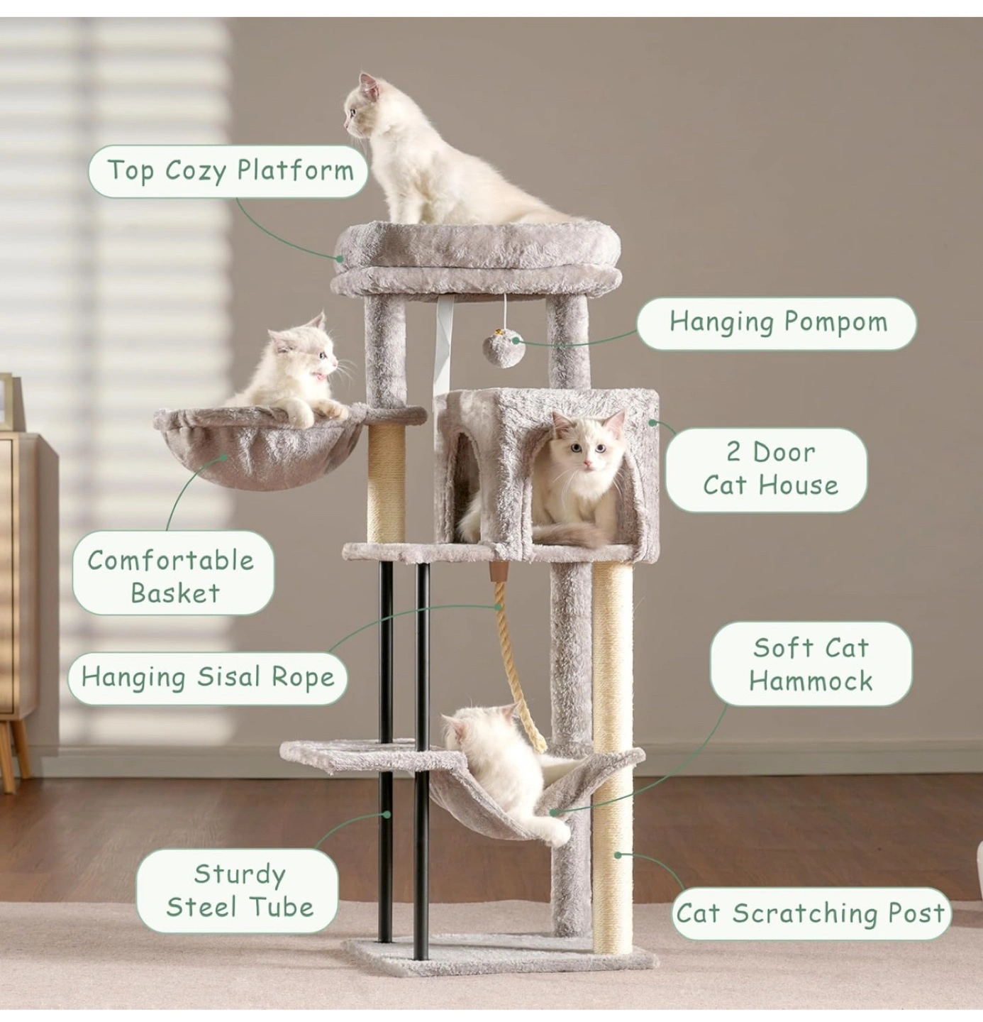 Multiple-platform Gitelsnour Cat Tree. Includes a cozy top platform, comfortable basket, Hammock, and Scratching Post. Light Gray Brand new