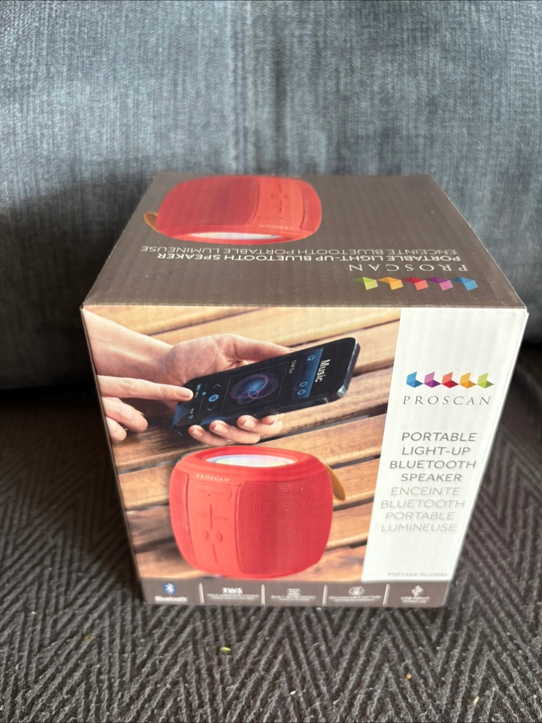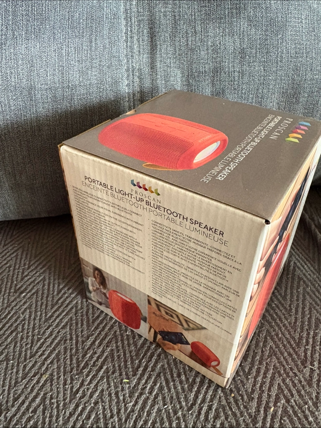 A portable Bluetooth speaker. It is new in its original box. The speaker lights up, perfect for a relaxing time listening to your favourite music. Never opened