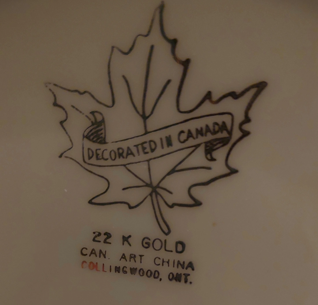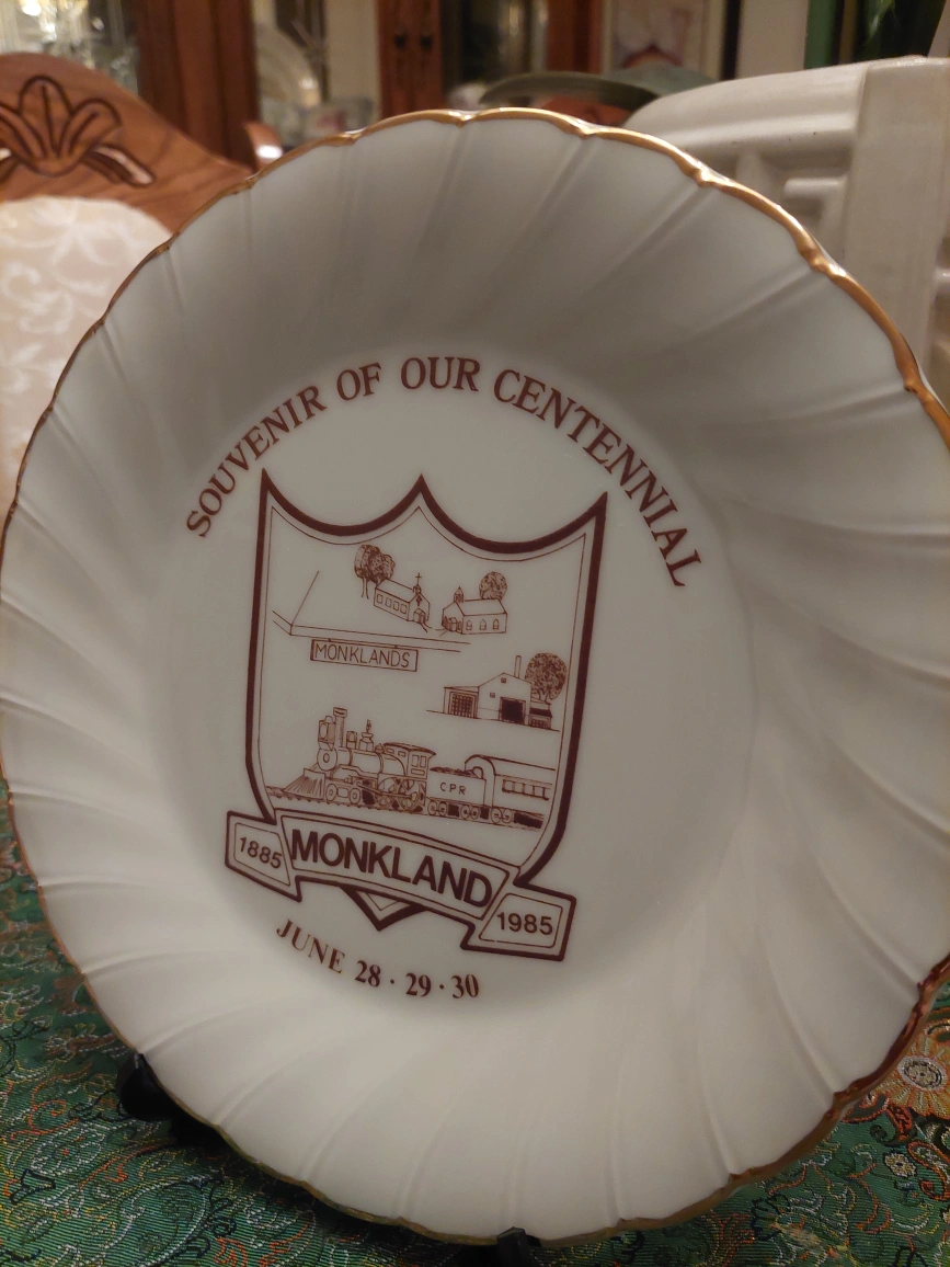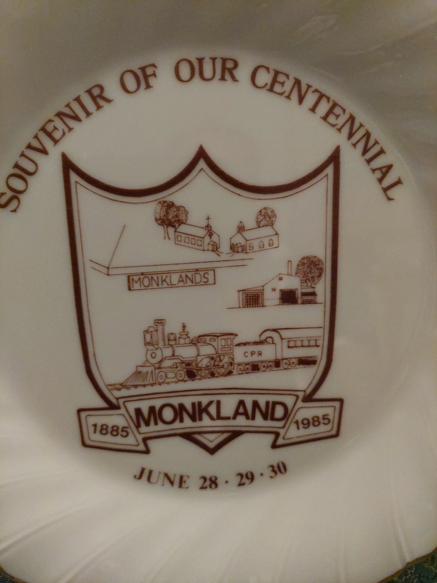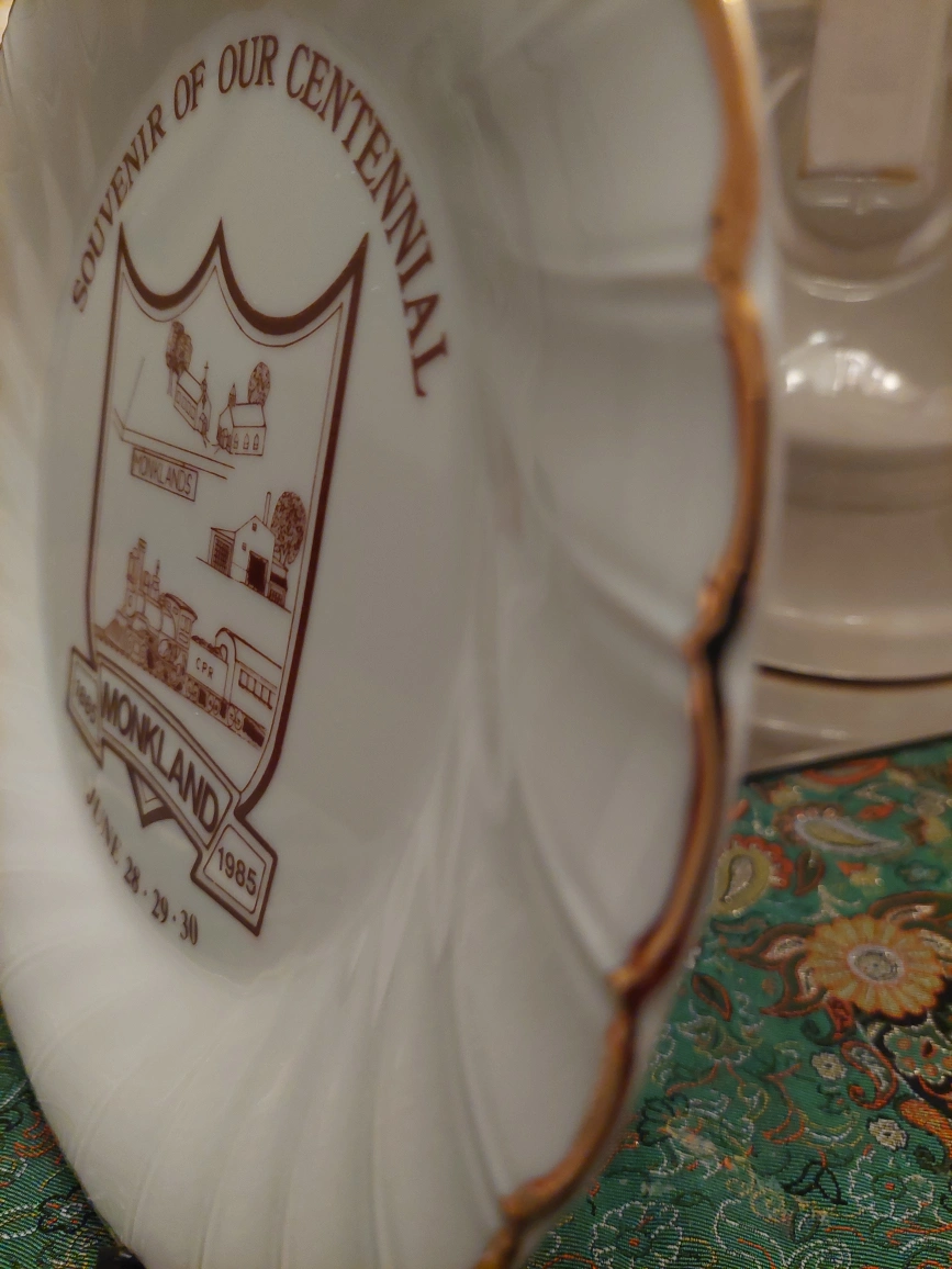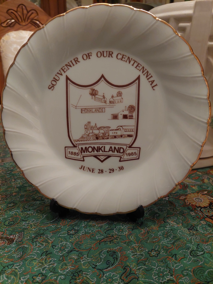A white decorative plate. The rim has a gold trim, and it has an elegant wavy design. Features a crest that commemorates Monkland's Centennial celebration. A lovely plate to display with pride.