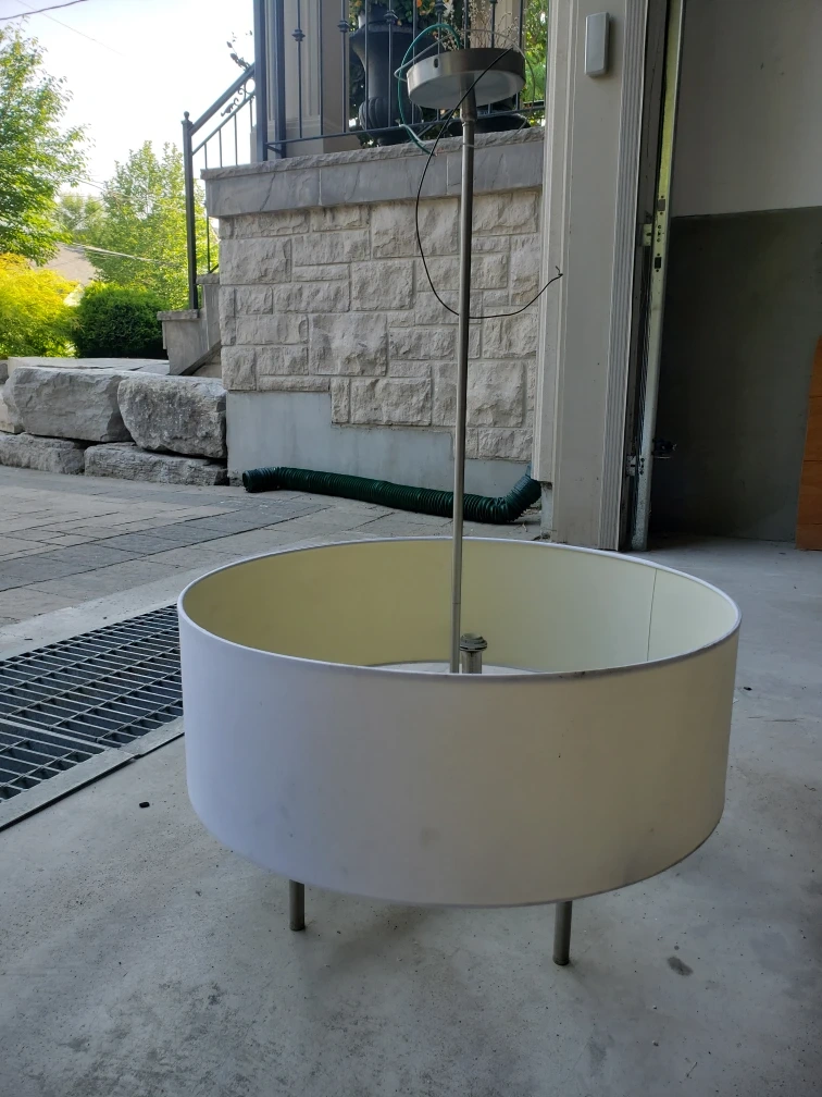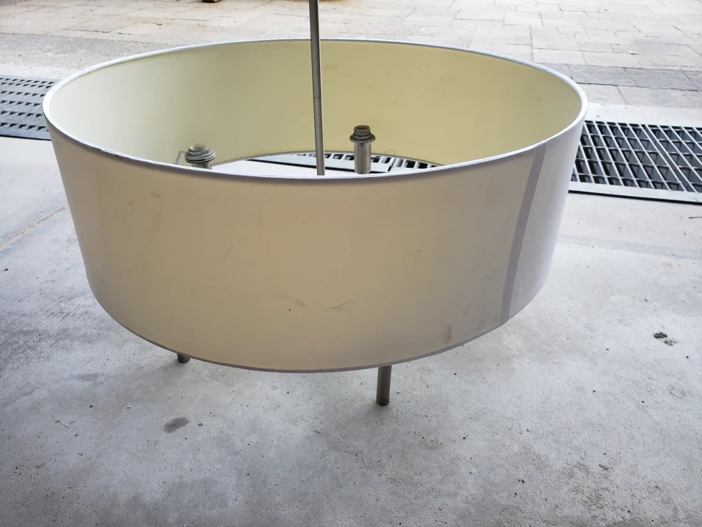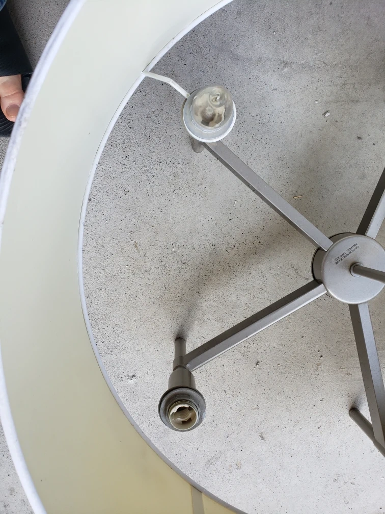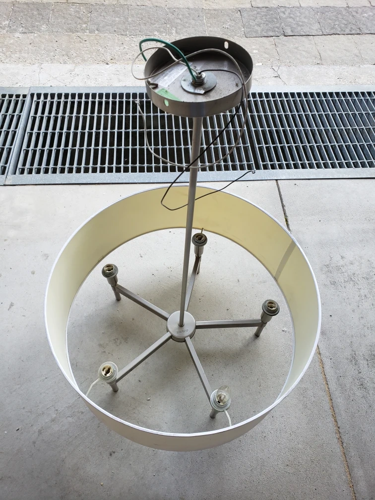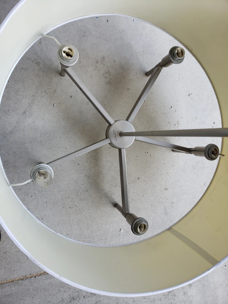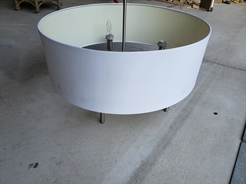 It is a circular, white chandelier with a metal frame. Has five bulb sockets around the outside.