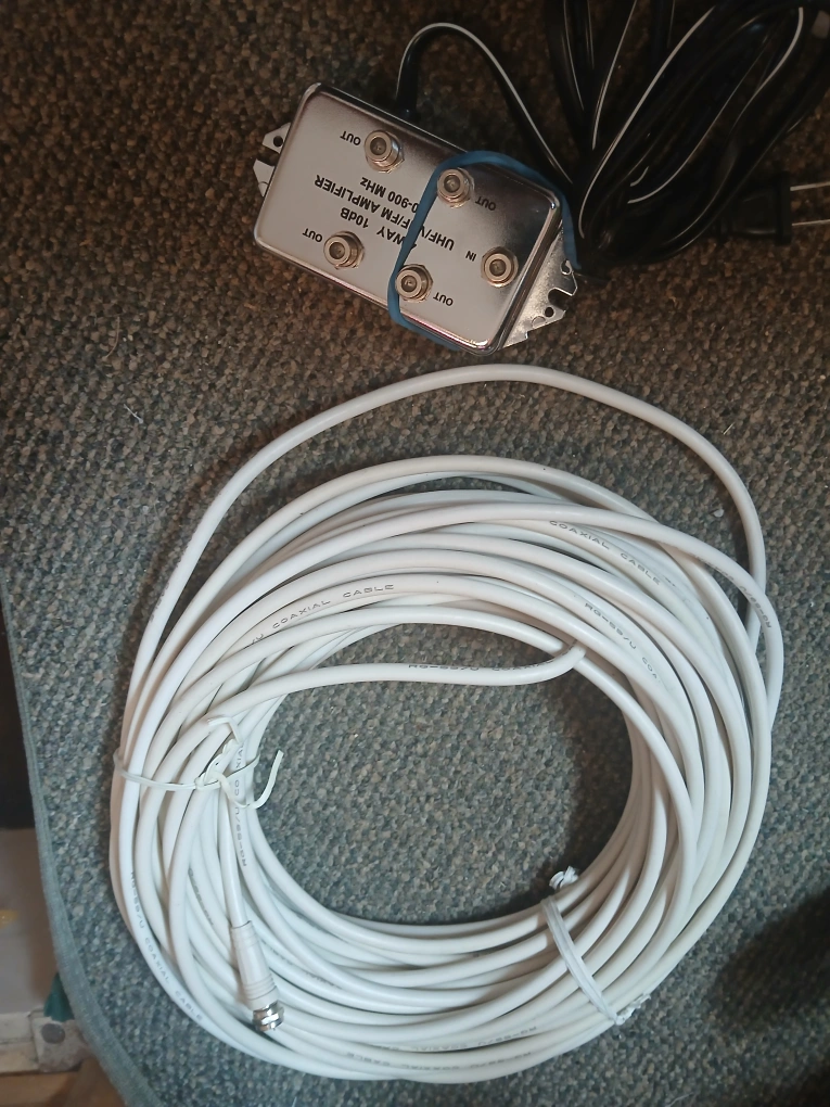 This used 4-way 10dB UHF/VHF/FM Amplifier, operating between 0-900 MHz, is perfect for boosting your signal, along with a generous length of white coaxial cable. The amplifier shows signs of wear but is fully functional, ready to enhance your viewing and listening experience. * **Type**: 4-Way Amplifier * **Frequency Range**: 0-900 MHz * **Gain**: 10dB If the ad's still kickin', the items are still clickin' – get 'em while they're hot!